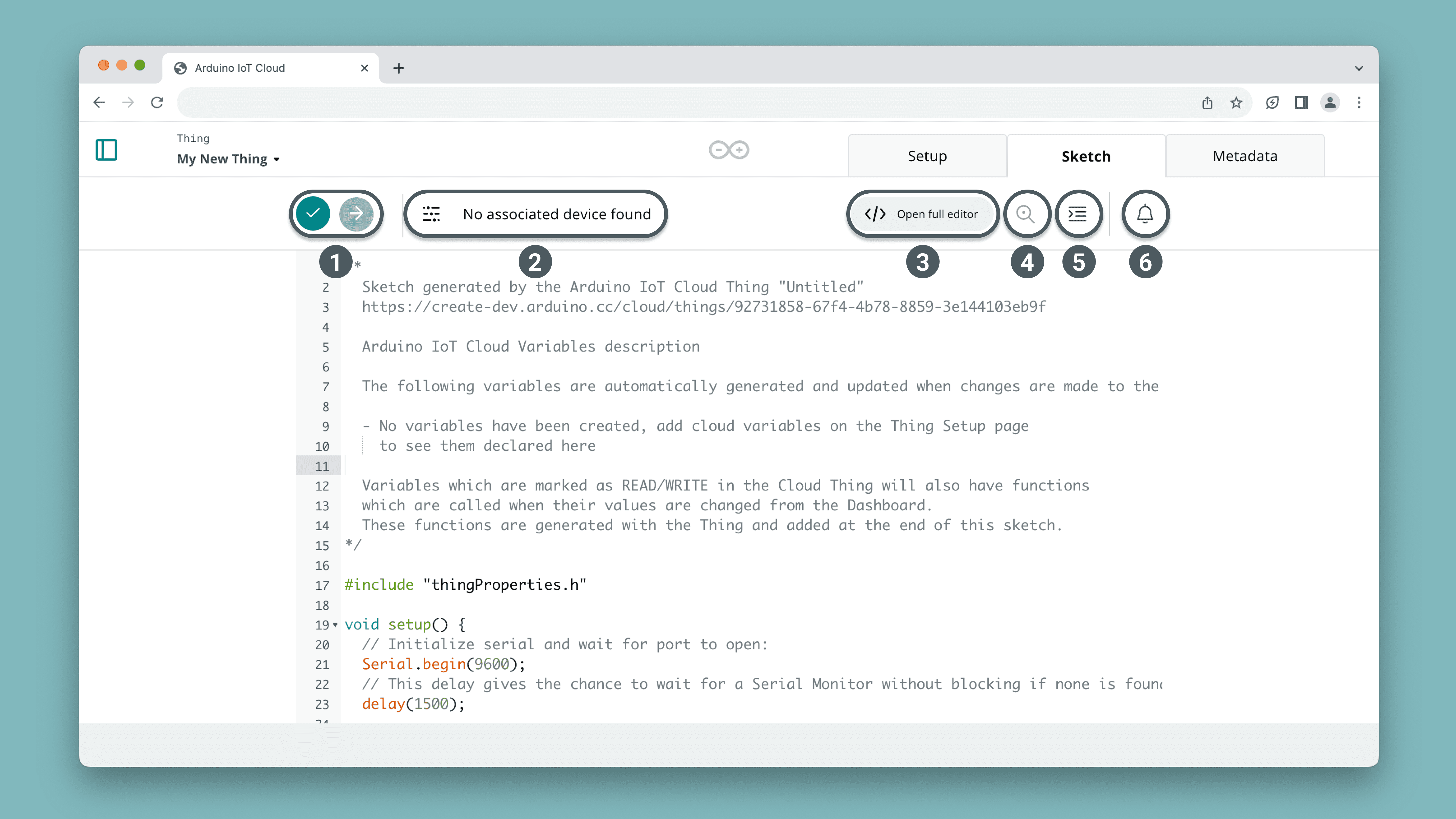 The sketch tab contains a built-in editor where you can edit, compile and upload sketches to your devices.