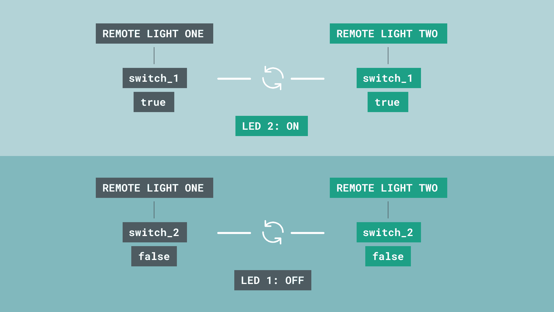 The connection between the boards is made through the syncing of variables, which allows two Things to communicate with each other. In this case, whenever a boolean is activated on one device, it is also activated on the other device. This remote ON/OFF switch is a great building block for creating other cool IoT projects.