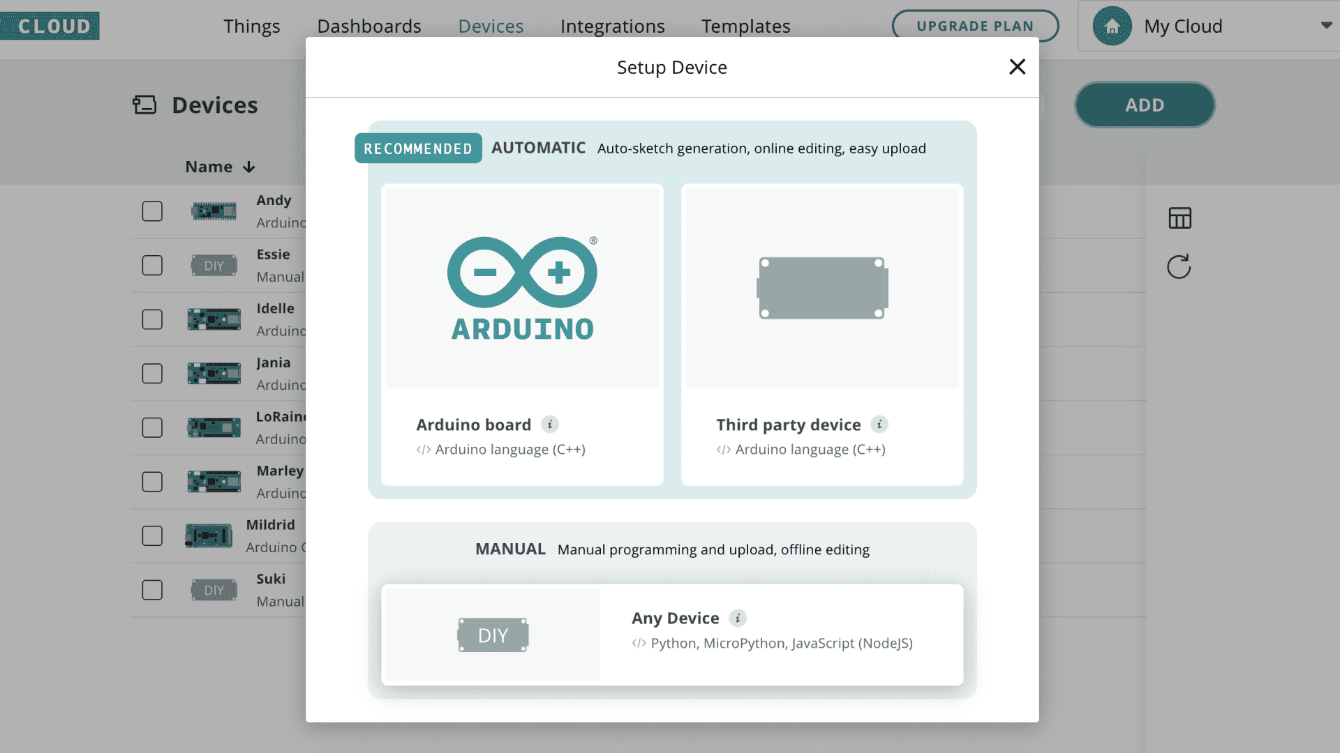 Manual configuration is recommended for more advanced users, mainly those that are looking to integrate existing projects with the Arduino Cloud.