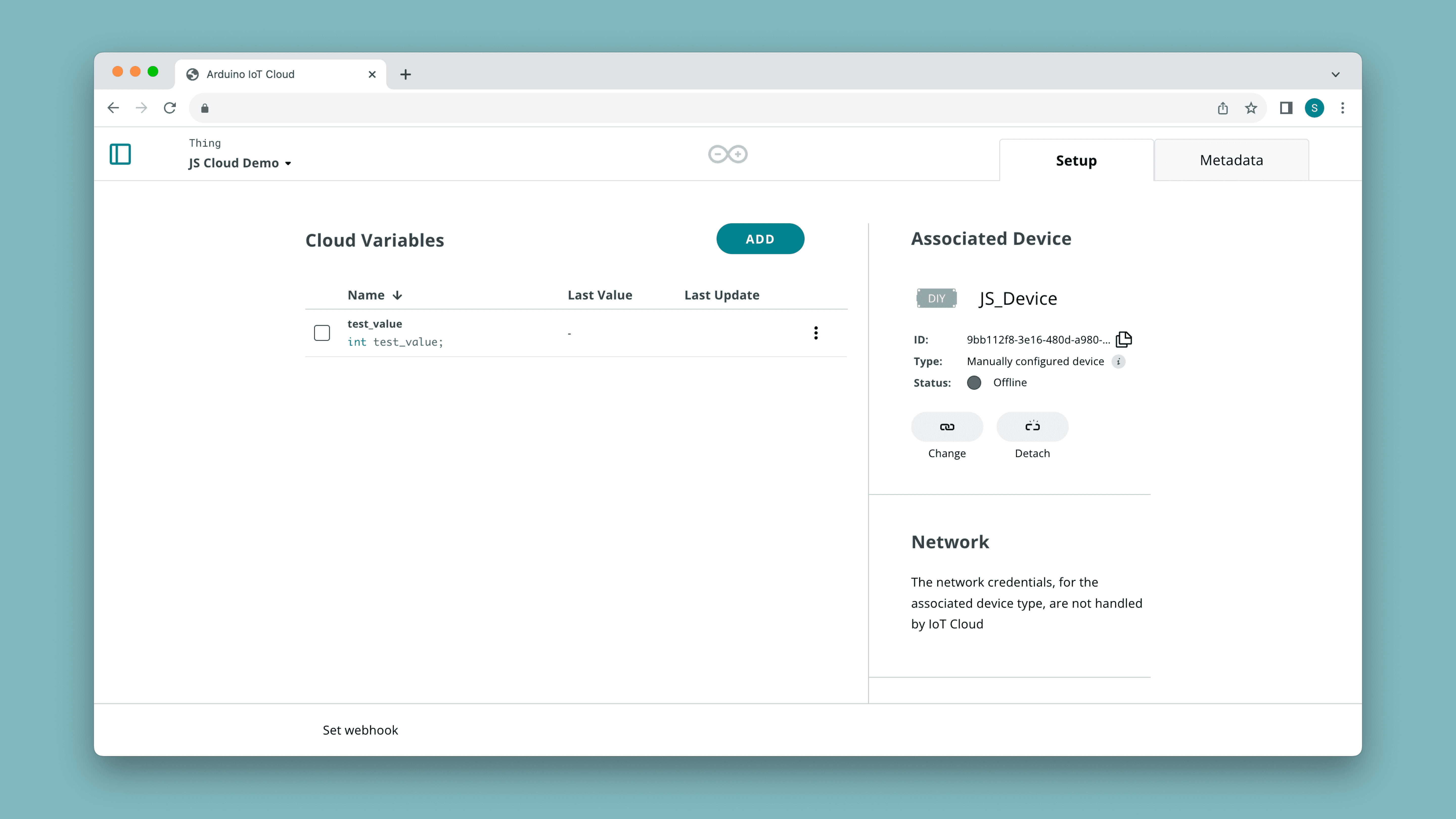 Variables that we create here can also be synchronized with variables running on any other device in the platform. This makes it possible to link an Arduino boards with a Python or JavaScript project without writing any connection code!