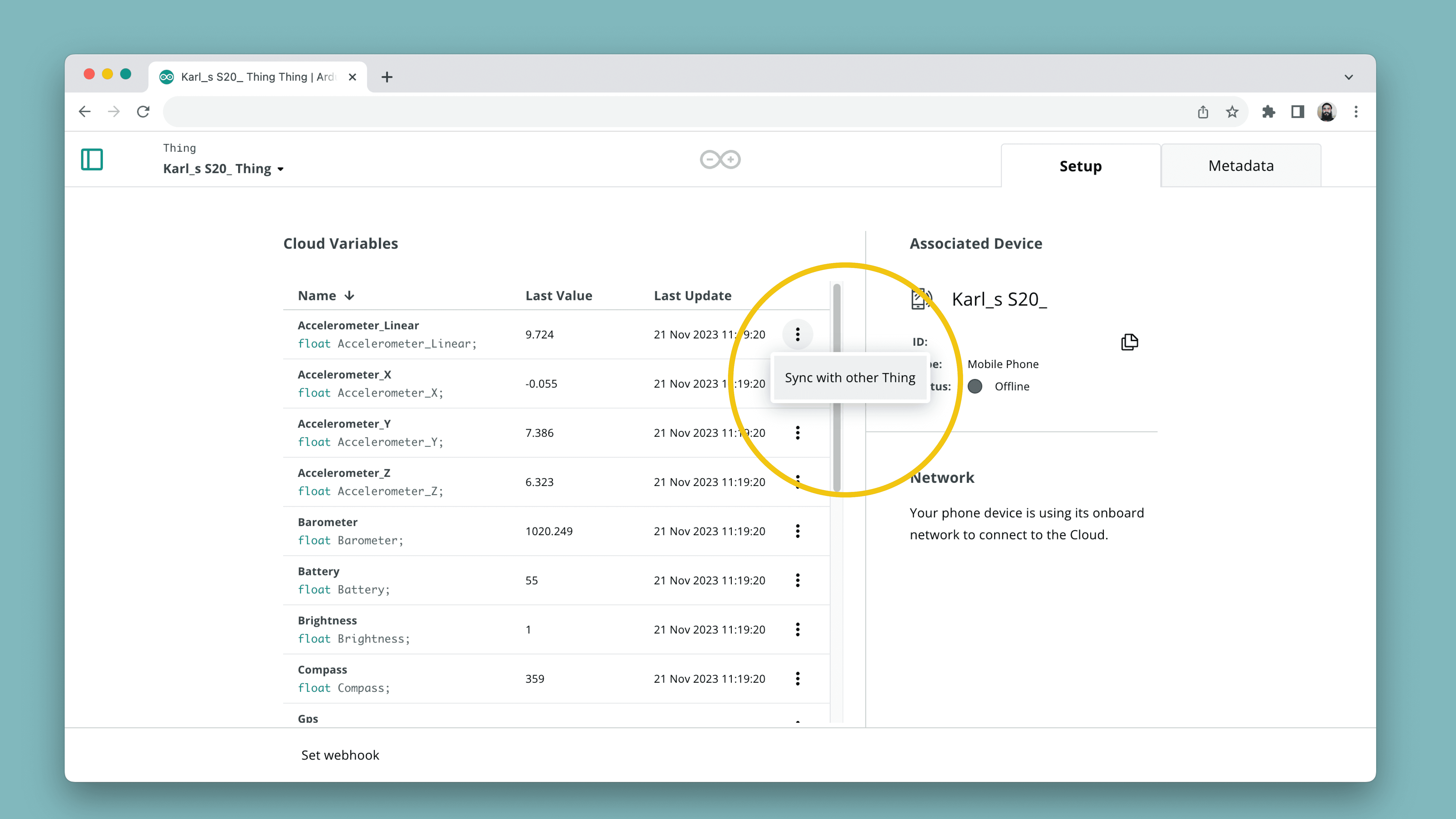 The sensor data from your phone is tracked through variables in the Arduino Cloud, and can therefore be synchronized with other variables.