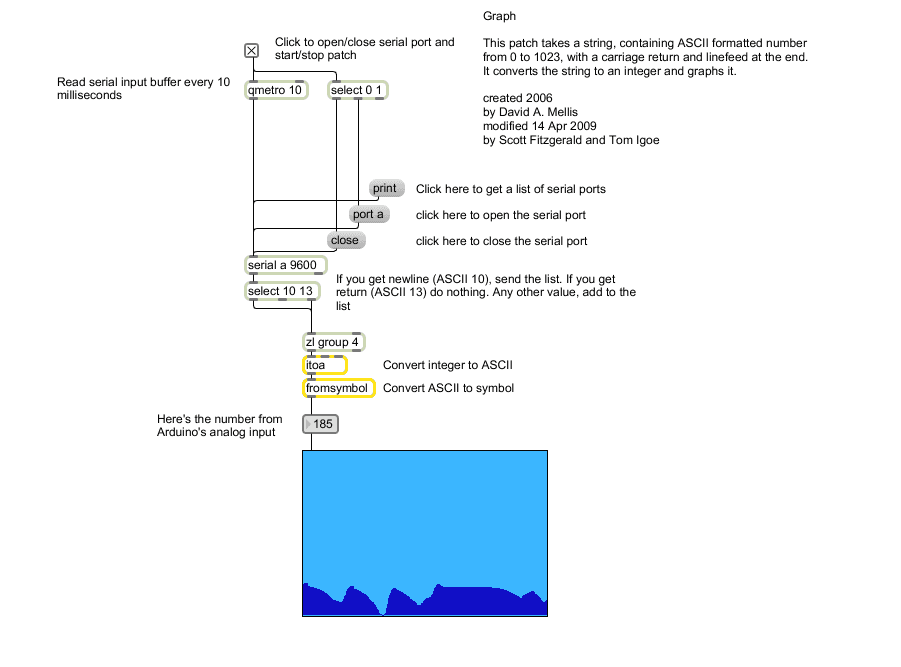 The max patch looks like this. The text of the patch is in the code sample above. Copy the text and paste it into a new Max window to see the sketch.