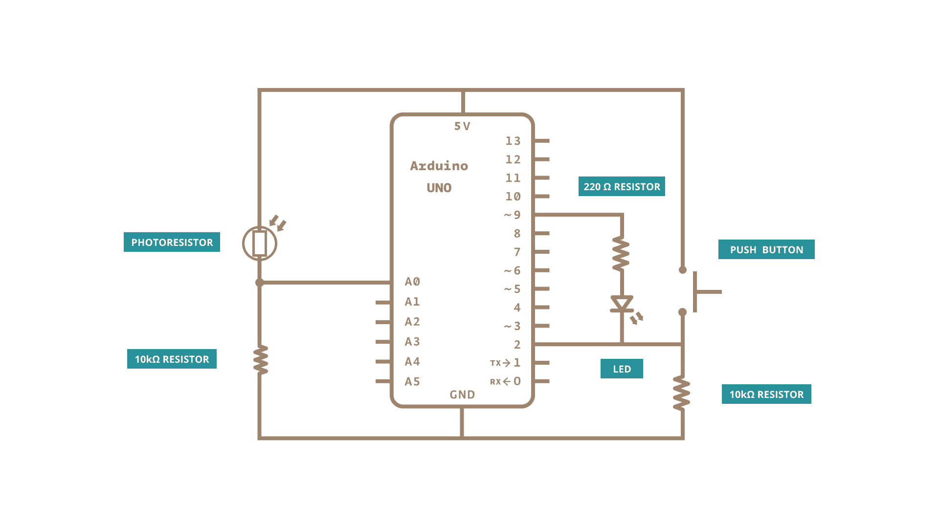 Connect your analog sensor (e.g. potentiometer, light sensor) on analog input 2 with a 10K ohm resistor to ground. Connect your button to digital pin, again with a 10K ohm resistor to ground. Connect your LED to digital pin 9, with a 220 ohm resistor in series.