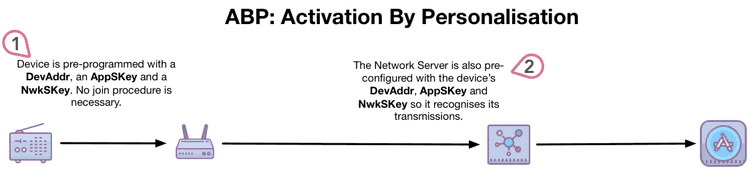 • Activation by Personalization (ABP): In this method, end-devices are personalized to work with a given LoRaWAN® network. End-devices are pre-provisioned with the NwkSKey and AppSKey and the 32-bits device network address.