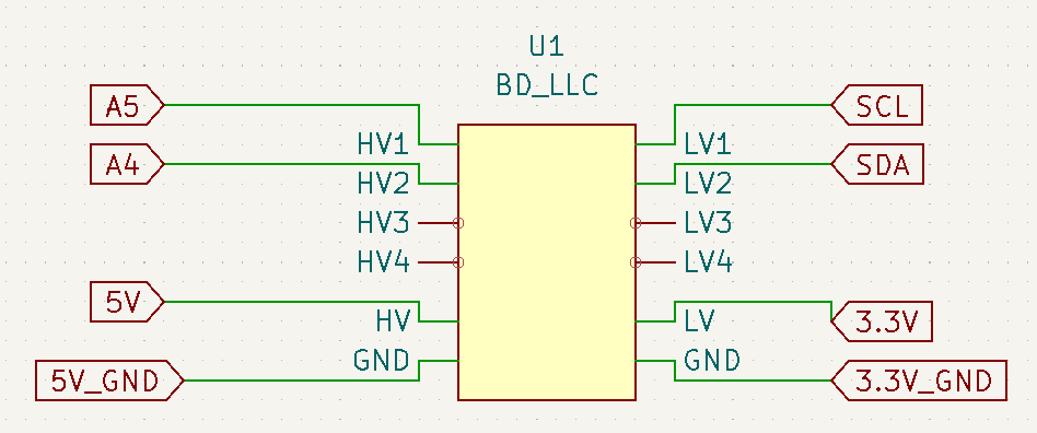The circuit above uses the bi-directional logic shifter to establish I2C interface with any sensor capable of the protocol. The SCL and SDA lines go through a High Voltage channel and establishes communication with the sensor that is connected at its respective Low Voltage Channel.