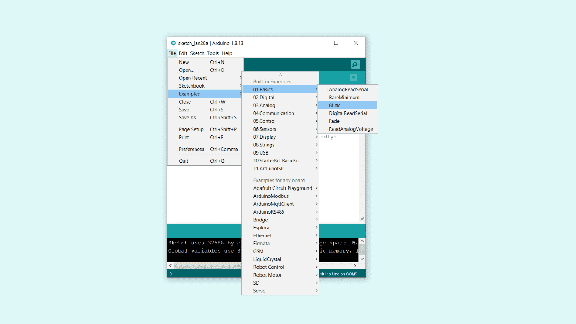8. Let’s try an example: navigate to File > Examples > 01.Basics > Blink.