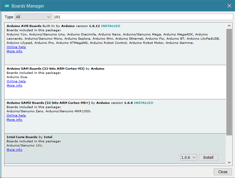 Here you can search Intel Curie or 101 to find the core. Click on its box and click on the install button. On the bottom bar of the window you can follow the download and install procedure, including the installation of the proper driver, needed by the operating system to use the 101 board. For more information about cores, see the guide on installing additional Arduino cores.