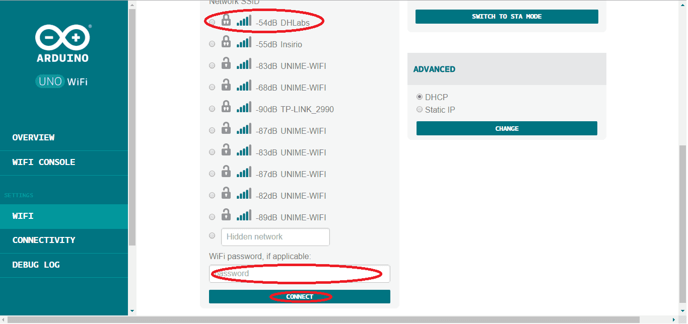 Connect the Arduino Uno WiFi to your AccessPoint Router, selecting your network from the WiFi Menu, insert the correct password and then click on CONNECT, as shown in the image below: