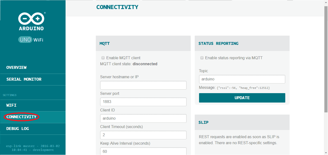 In the CONNECTIVITY section you can enable the connection services for example the client MQTT and the SLIP: