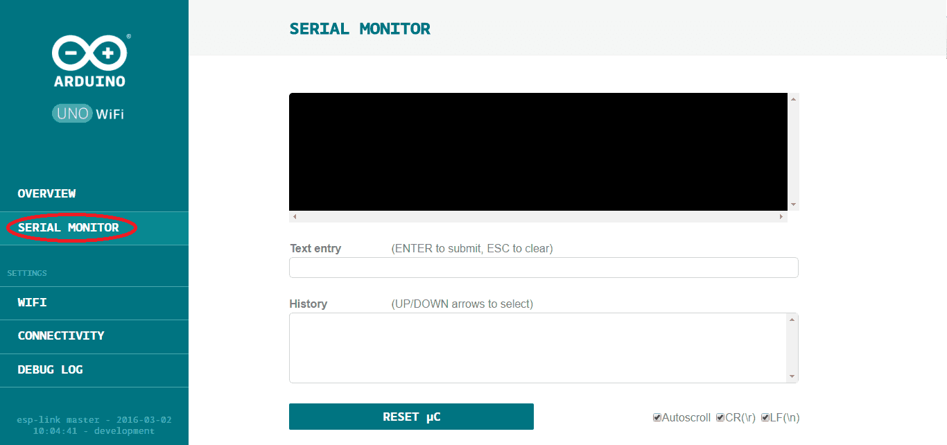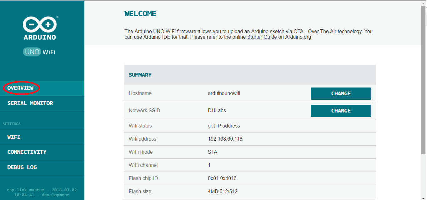 The Web panel has a simple menu that it is formed from five items: OVERVIEW, SERIAL MONITOR, WIFI, CONNECTIVITY and DEBUG LOG.