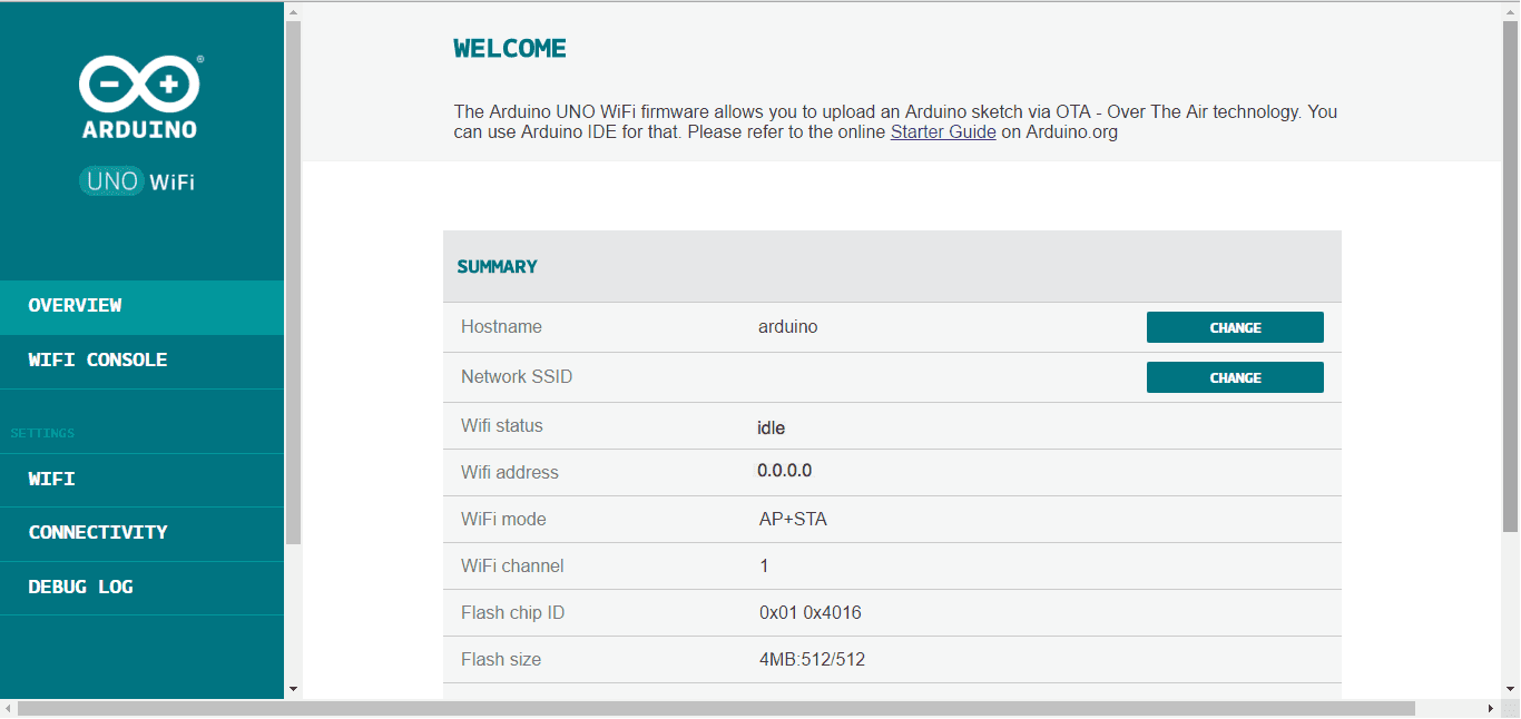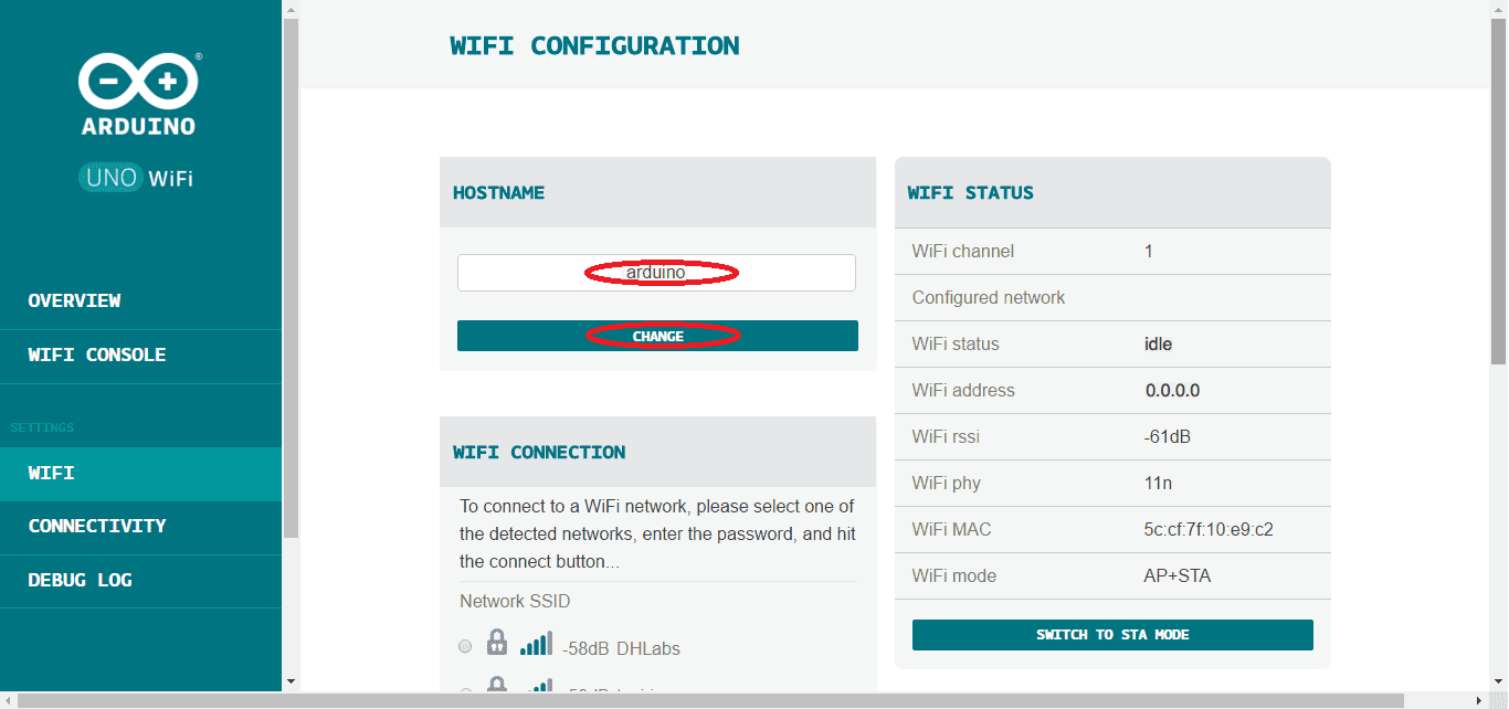 If you want to modify the hostname of the board then click on CHANGE from OVERVIEW menu or select the WiFi on the left menu and insert a new name under HOSTNAME field and after click on CHANGE.