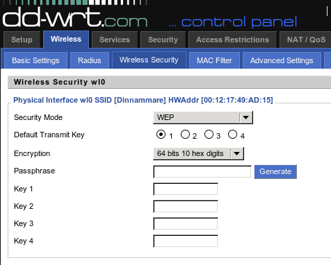 NB : WEP provides a basic encryption mechanism, but it can be cracked. If you require strong encryption for your network, it is recommended you use WPA
