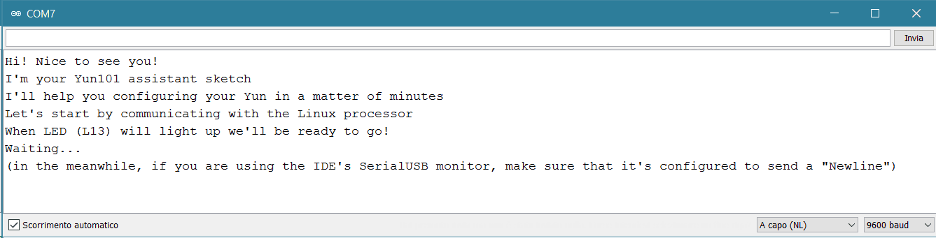 The blue LED on the shield will start to blink after a while; when the scanning process is over, the sketch will offer all the available APs in a numbered list. The time required to scan the network depends on the number of APs and their signal strength. You choose the AP to use typing in the input field the corresponding number. Please remember to enable "NewLine" in the Serial Monitor as End of Line.