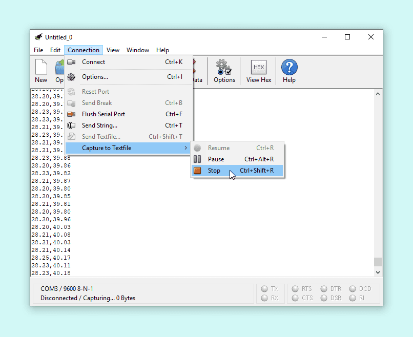 Click on the Disconnect button on CoolTerm’s interface, this will close the connection to the board. Click on Stop in the menu to stop the recording. The file will be on your desktop. It is a plain text file, which means that you can open it using a normal text editor. As long as it is not too big, you could open it and look inside.