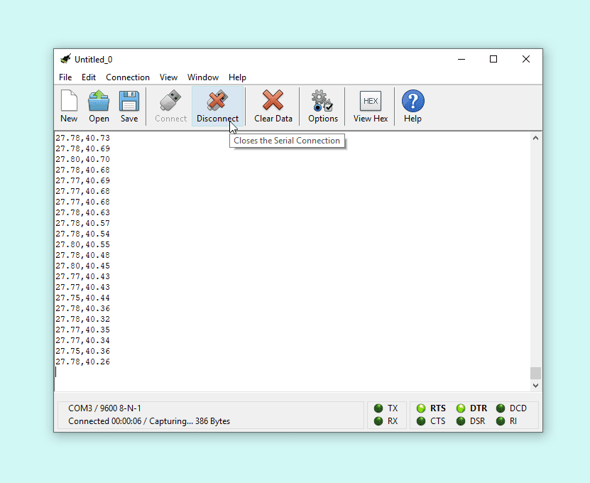 Click on the Connect button on CoolTerm’s interface, you will see how data is displayed while -in the background- it is being stored in the file you just created. Do not keep if for too long this time, we are recording data once every second, if you wait for a couple of minutes, you will have enough data to get some meaningful results. Since you are playing with temperature and humidity try to cover the sensor with your hand, blow air on it, place your board close to a cup with some hot liquid (not inside!!) … the data you will gather will be directly visible on the graph you will create later.