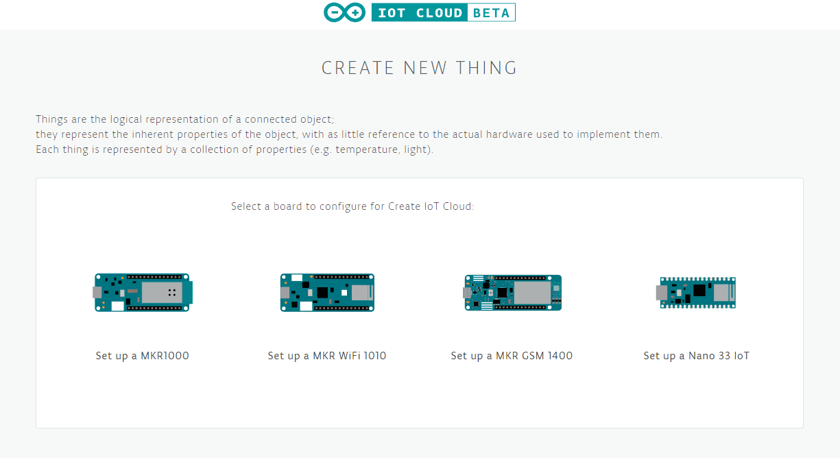 On this page, you will see that you can create new Things, that is what we call the devices that you can connect to the internet. Things represent, for example, your MKR1010, or any other board with connectivity. On top of that, each one of the boards can have different parameters. These are variables that will be exposed not only to the code on the board, but also to the Cloud, thanks to the Arduino Cloud library. If you are interested in learning about the process of setting a new Thing, please take the step-by-step tutorial linked on this page.