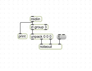A simple Max patch that will allow you to hear the notes generated by the MIDI commands looks like this :