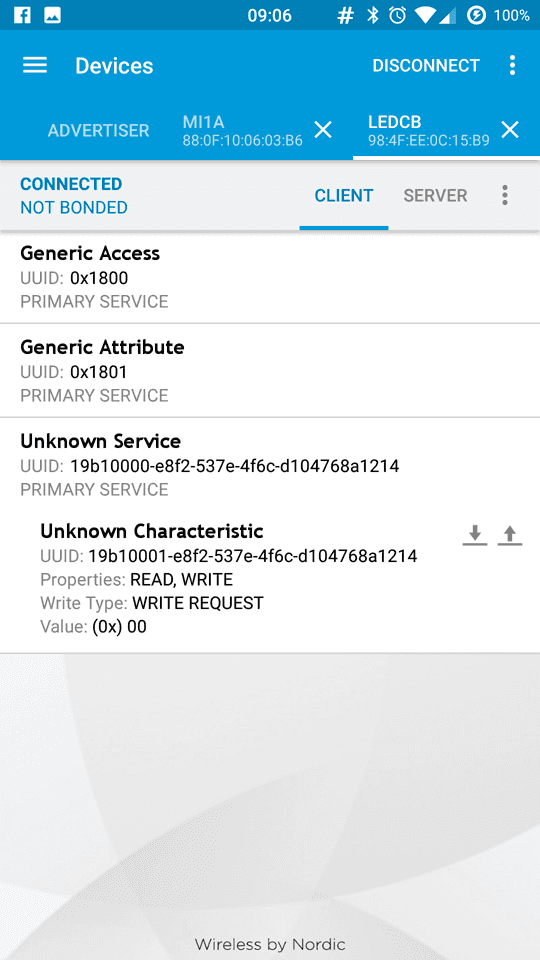 statement at the beginning of the sketch.Tap the Unknown Service to open up its characteristic, as shown below. It includes properties that can be written with a Write Request. you also find two icons on the right of the Unknown Characteristic. The arrow pointing down means read, the other means write.