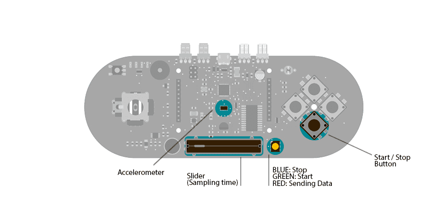 To start sampling, press the direction down push-button. This begins communication as a keyboard with the computer. Changing the position of the linear potentiometer will change the rate at which samples are read from the accelerometer and written to the computer.