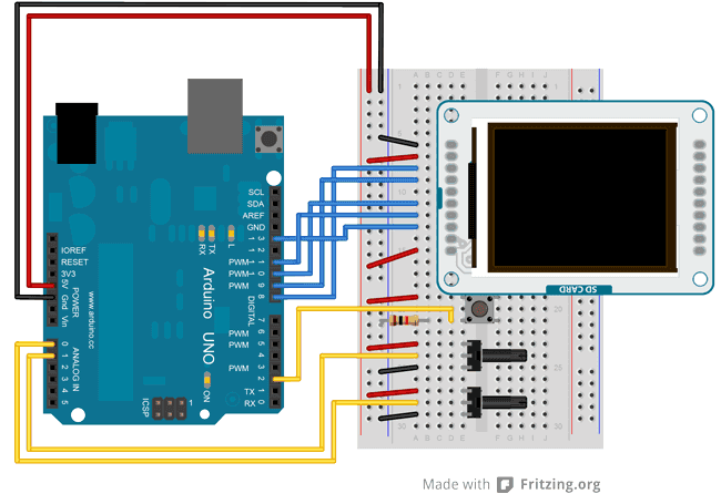 This example for the Arduino TFT draws a white line on the screen, based on the position of 2 potentiometers. If you press a momentary button, the screen will erase.