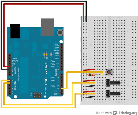 Put a switch across the center of the breadboard. Connect one end to power, the other end to the Arduino digital pin 2. Connect the same pin to ground through a 10-kilohm pull-down resistor