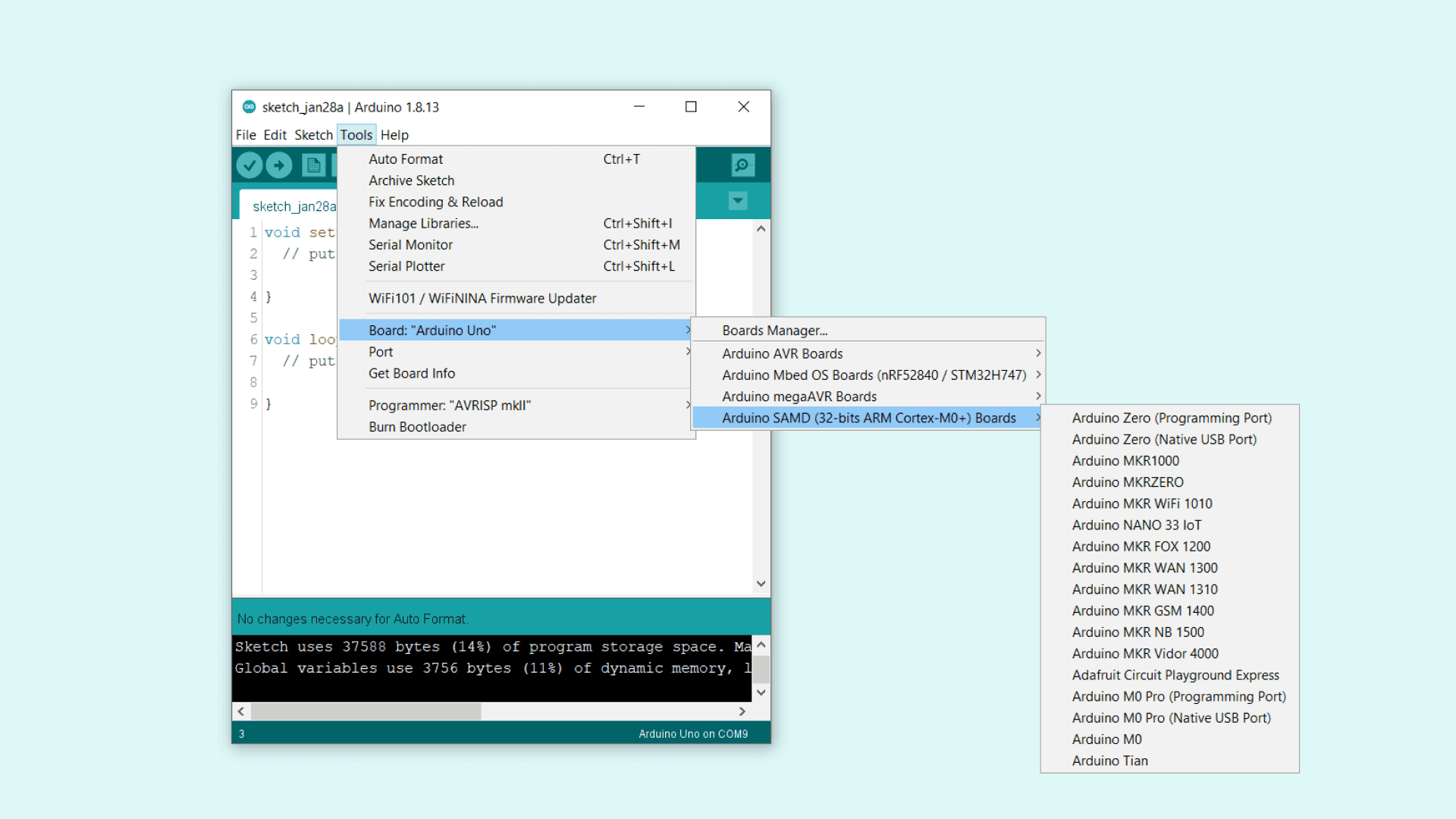 Exit the board manager, and go to Tools > Board > Arduino SAMD Boards (32-bits ARM Cortex-M0+). Here you can see all the SAMD boards listed, where you can select the MKR board you are using. You have now successfully installed the core.