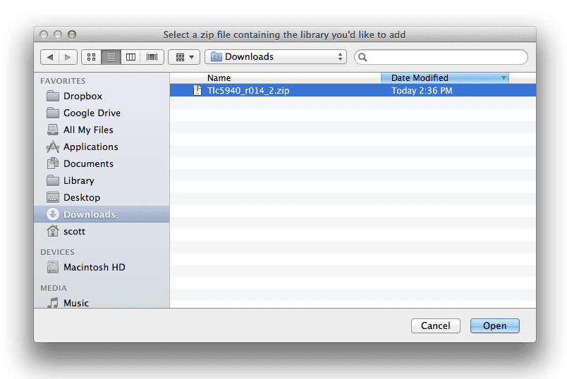 You will be prompted to select the library you would like to add. Navigate to the .zip file's location and open it.