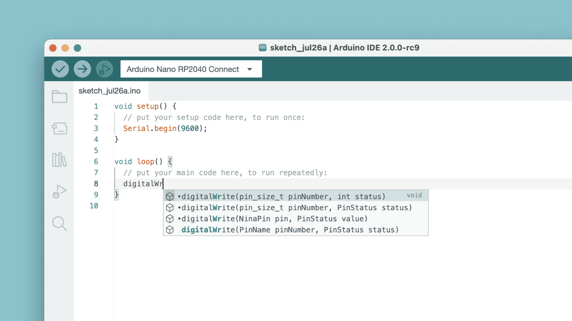 Autocompletion is a must-have for code editors, and the 2 version comes well equipped. When writing code, this is useful to understand more about the elements of the Arduino API.