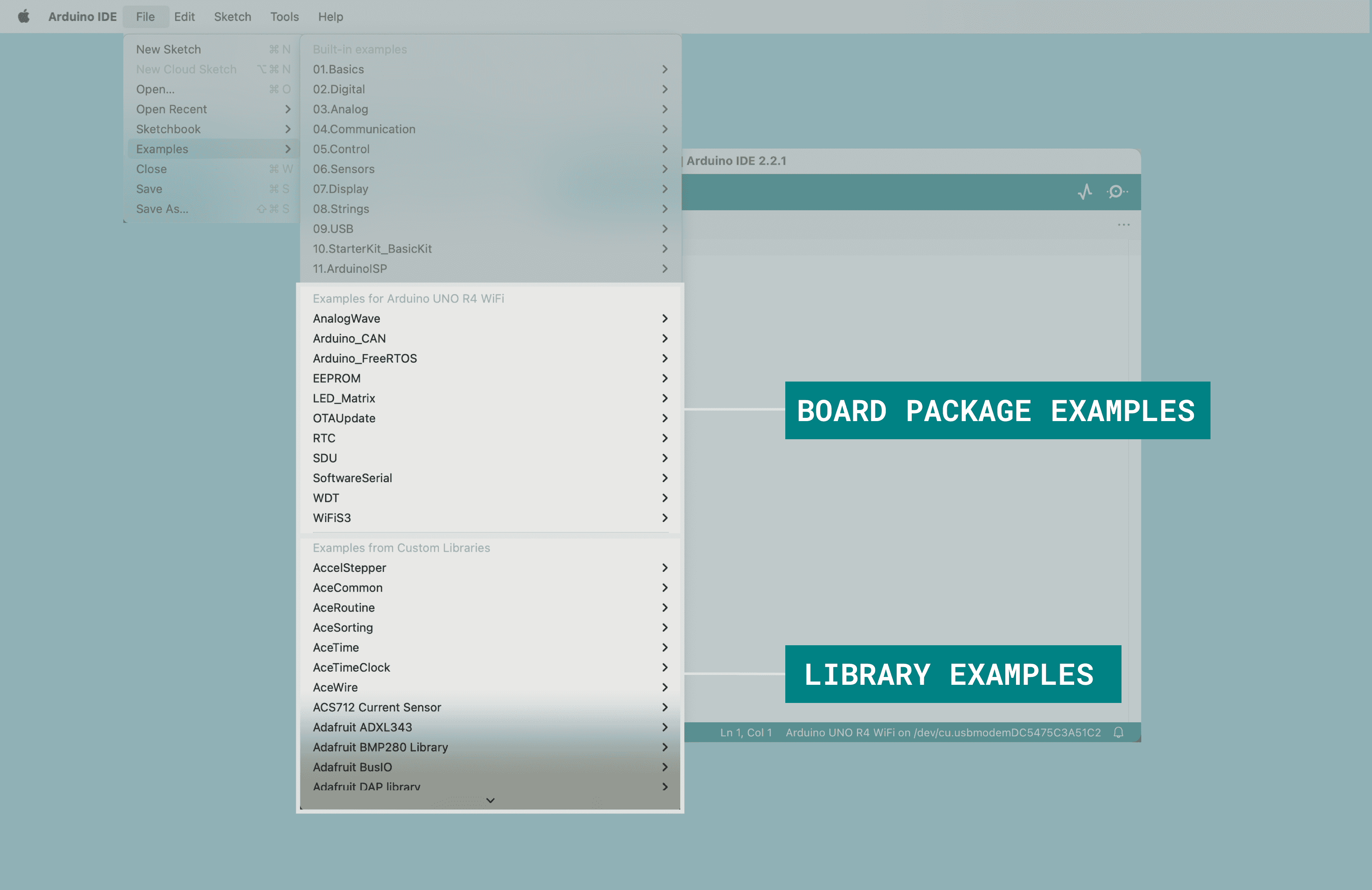 To open the example sketches bundled in either the libraries you have installed manually or that come bundled in board packages, navigate to File > Examples and find the library you're searching for in the list that appears.