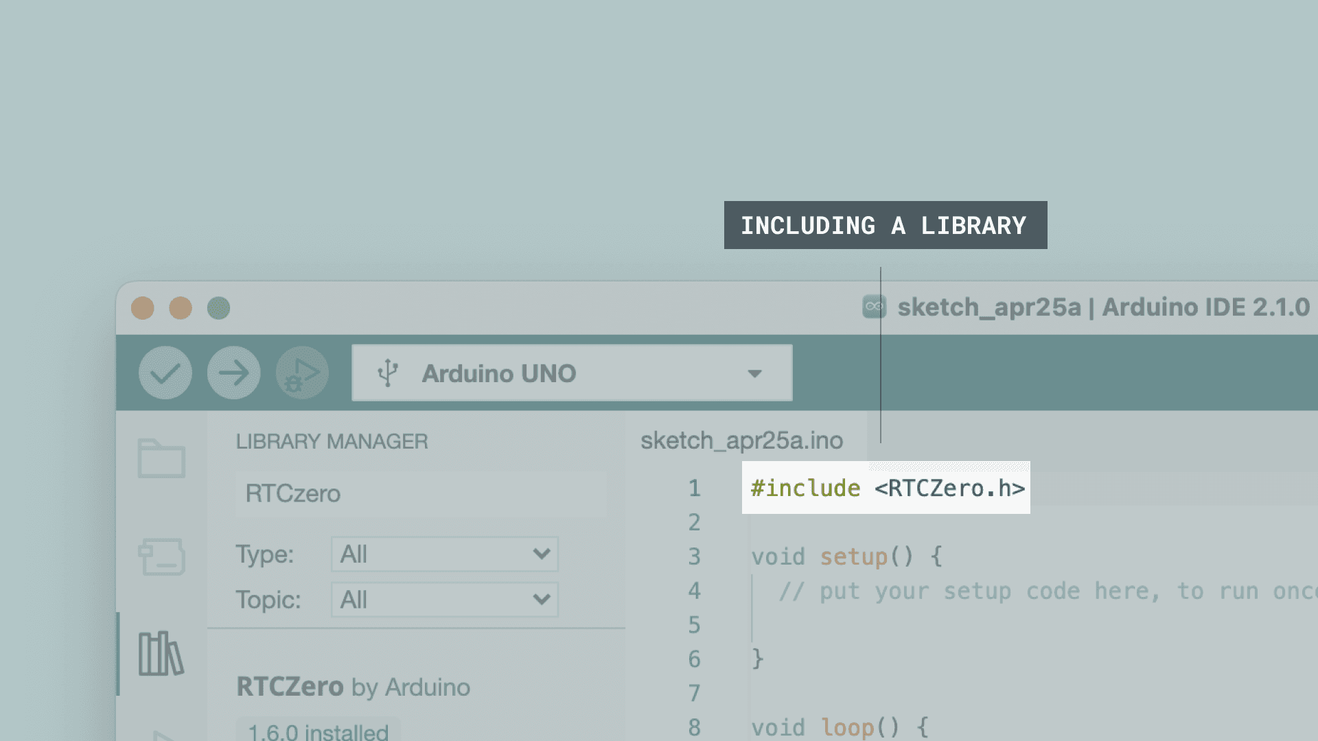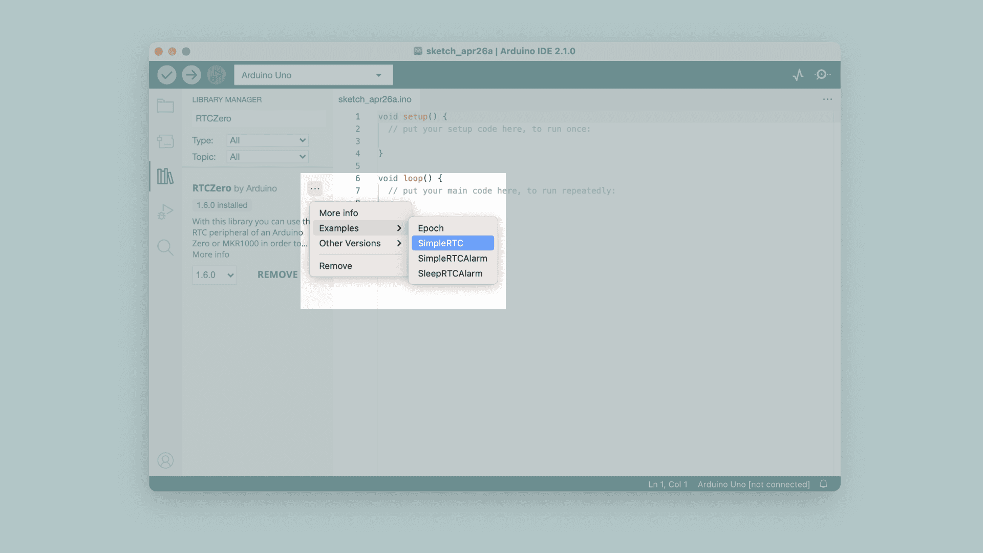 Almost all libraries come with already made examples that you can use. These are accessible through File > Examples > {Library} > {Example}. In this example, we are choosing the RTCZero > SimpleRTC.