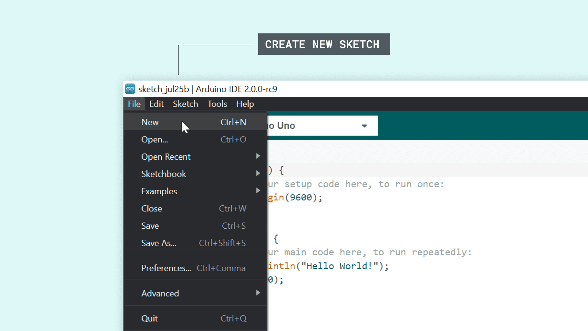 2. Now, we need to create a sketch that includes some configurations needed, so that our board can communicate with our computer. Mainly, we need to set a baud rate, which is done by writing