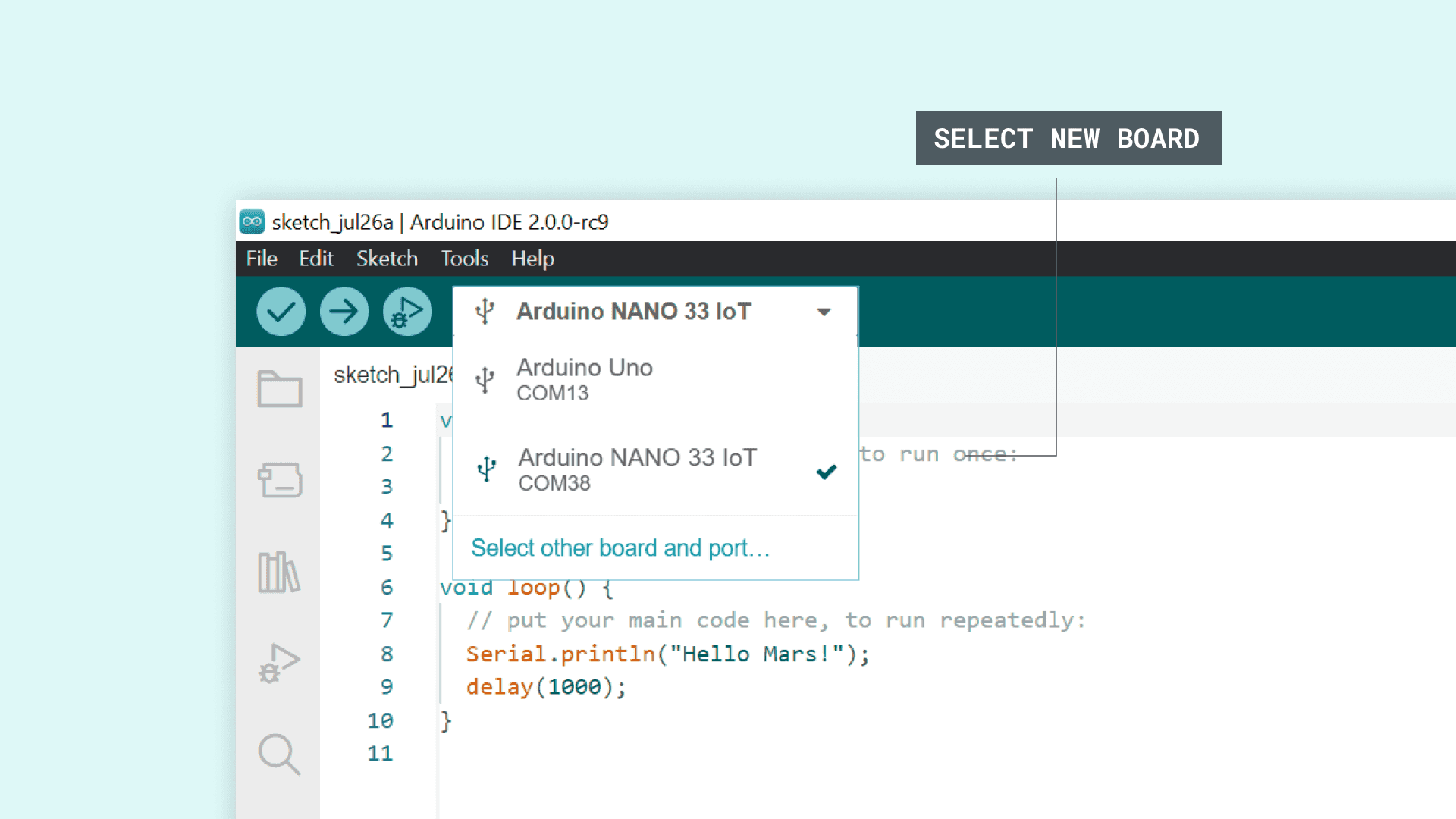 , every one second to the Serial Monitor. Let's select the board we want to use, and upload the sketch to the board.