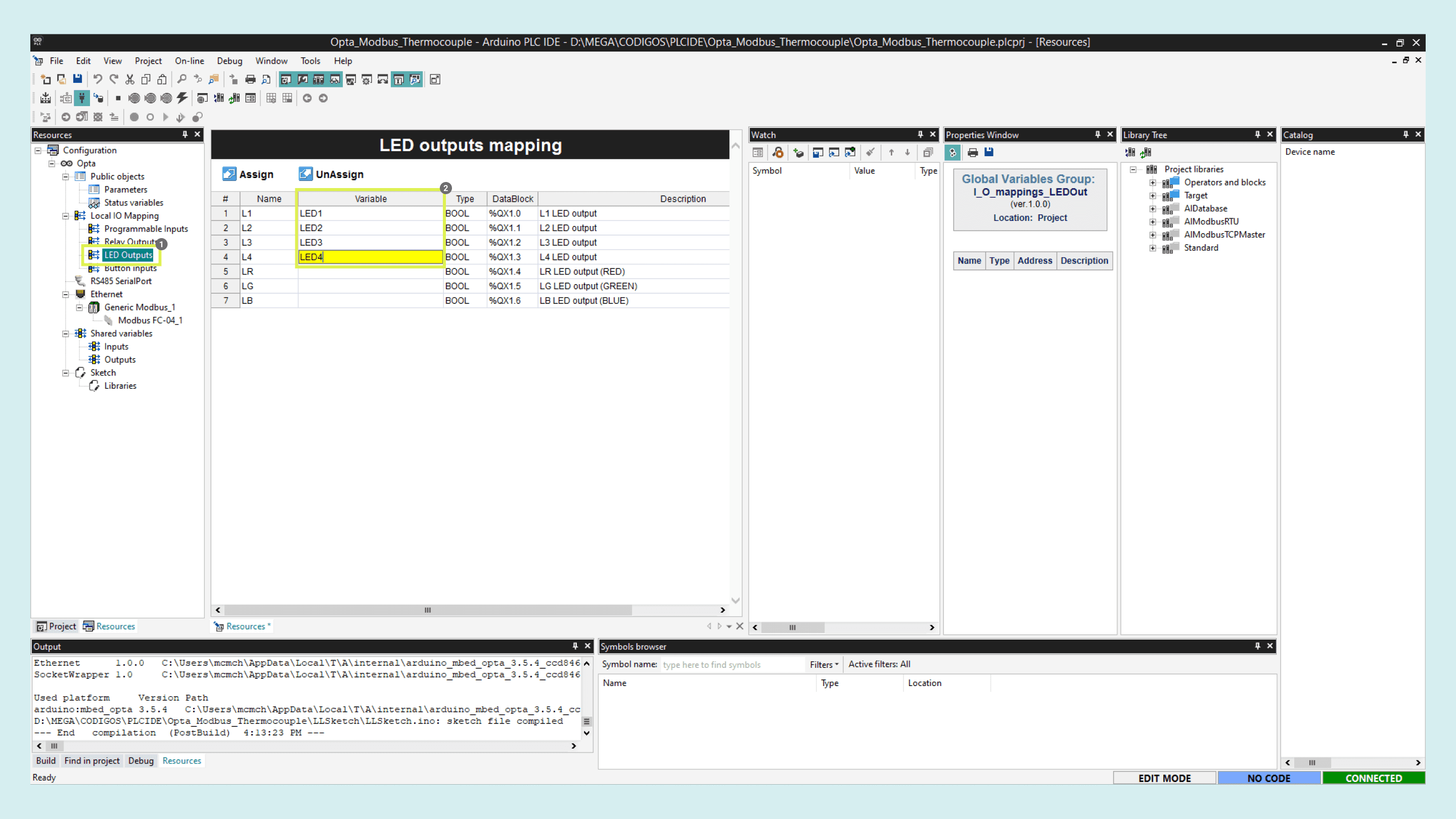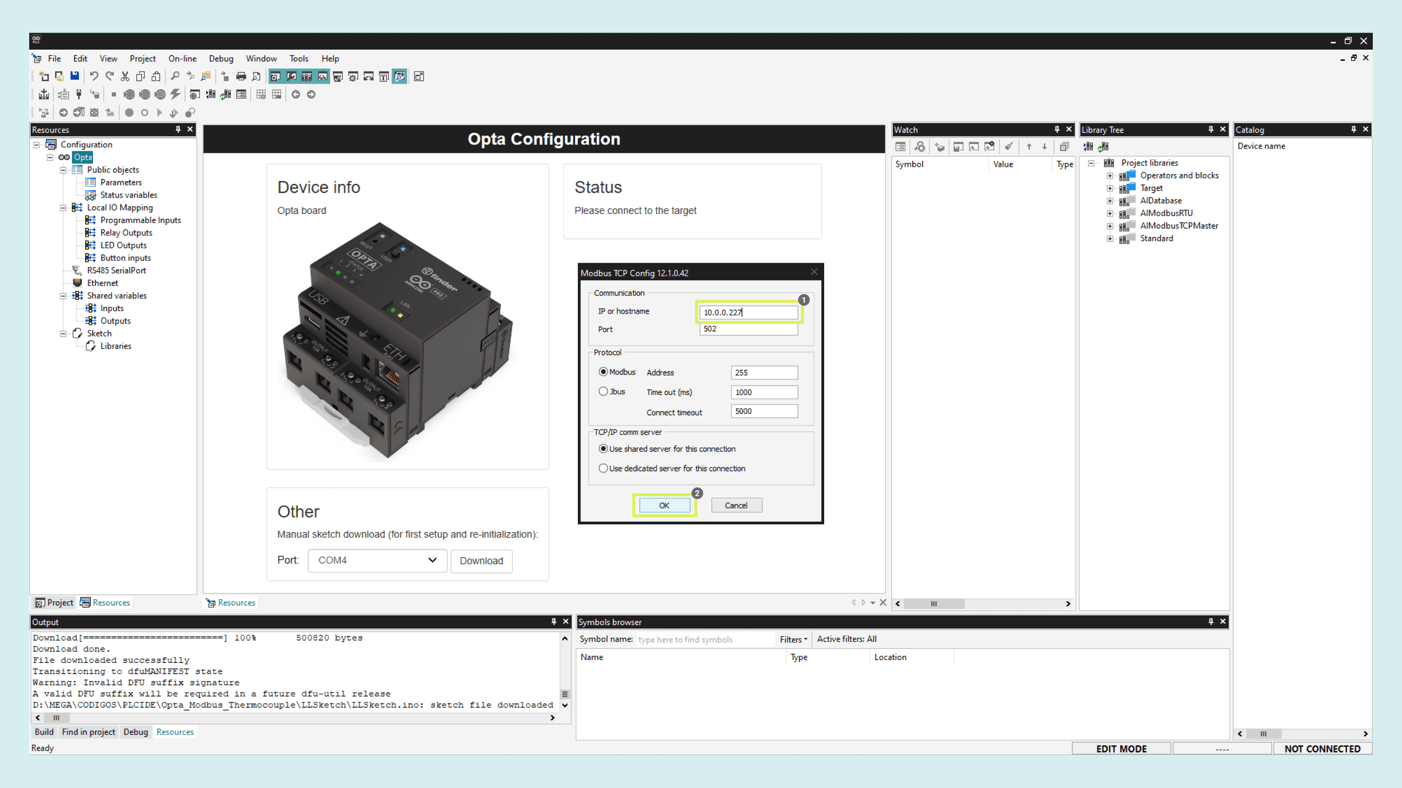 With the Opta™ successfully connected to the PLC IDE, it is time to configure the Modbus TCP communication.