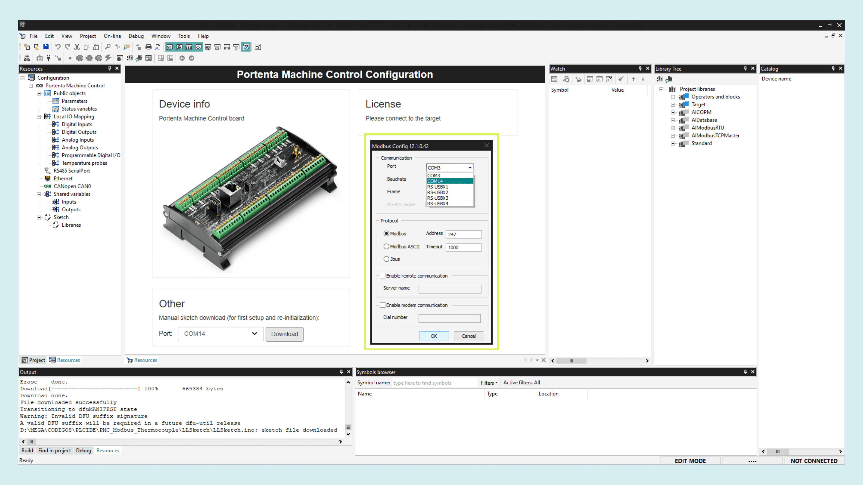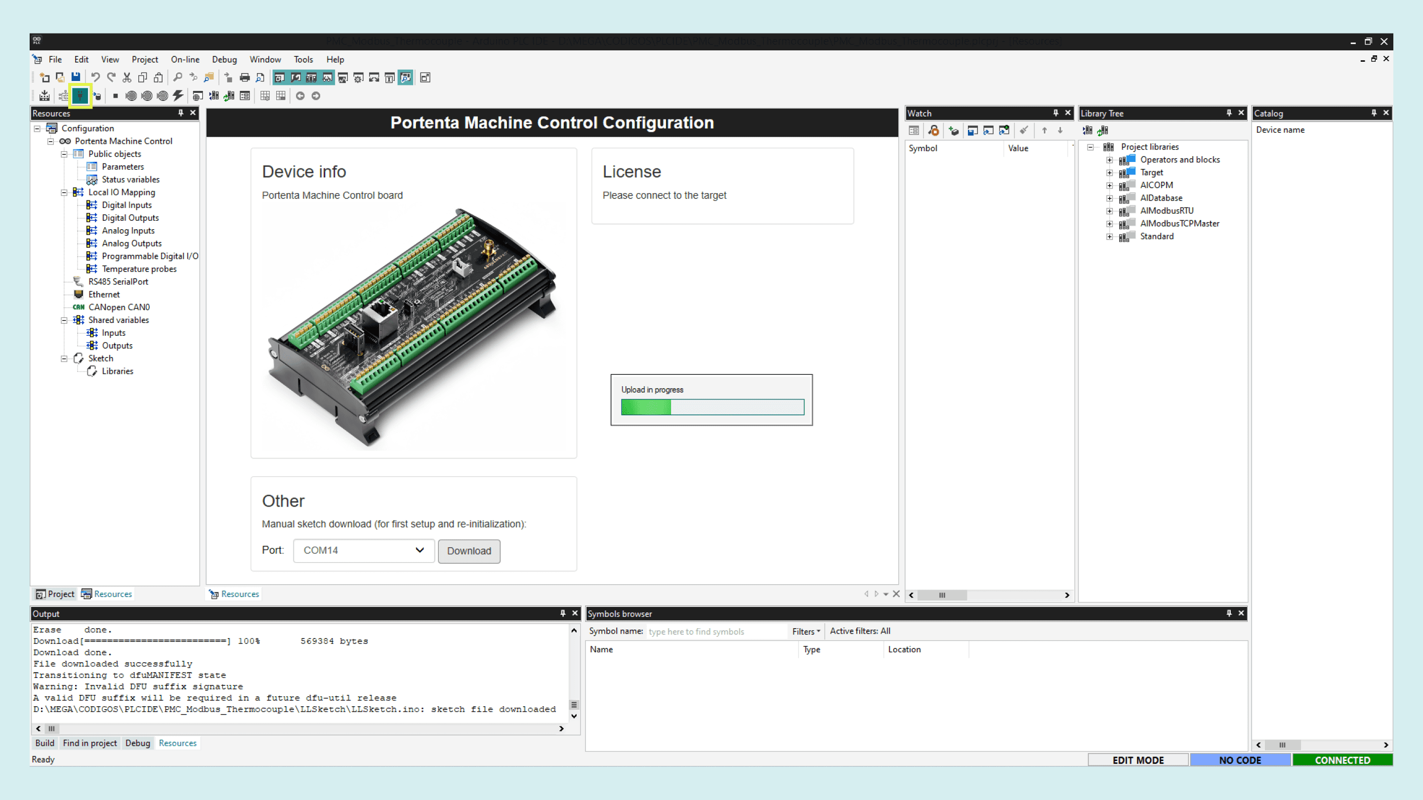 Connect the Machine Control to the computer using a micro USB cable, the board needs to run a specific program (runtime) in order to interact with the PLC IDE. To flash it, select the device serial port and click on download.