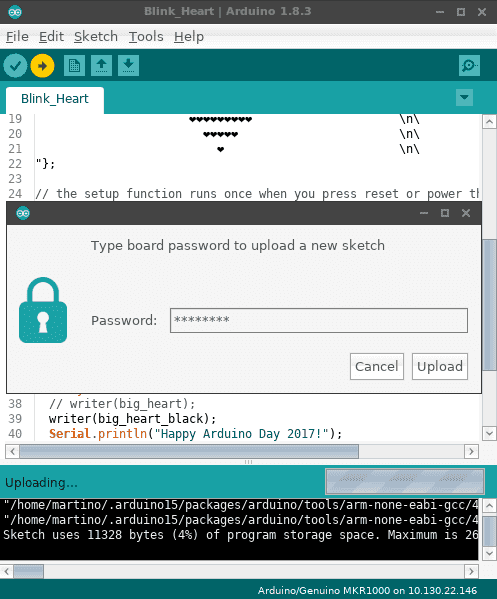 . If you forget about this you will lose the ability to upload over the air again (but you can still upload via serial, of course)We are now ready to upload our new sketch wirelessly! Select the correct Network port in the Ports menu and press "Upload"