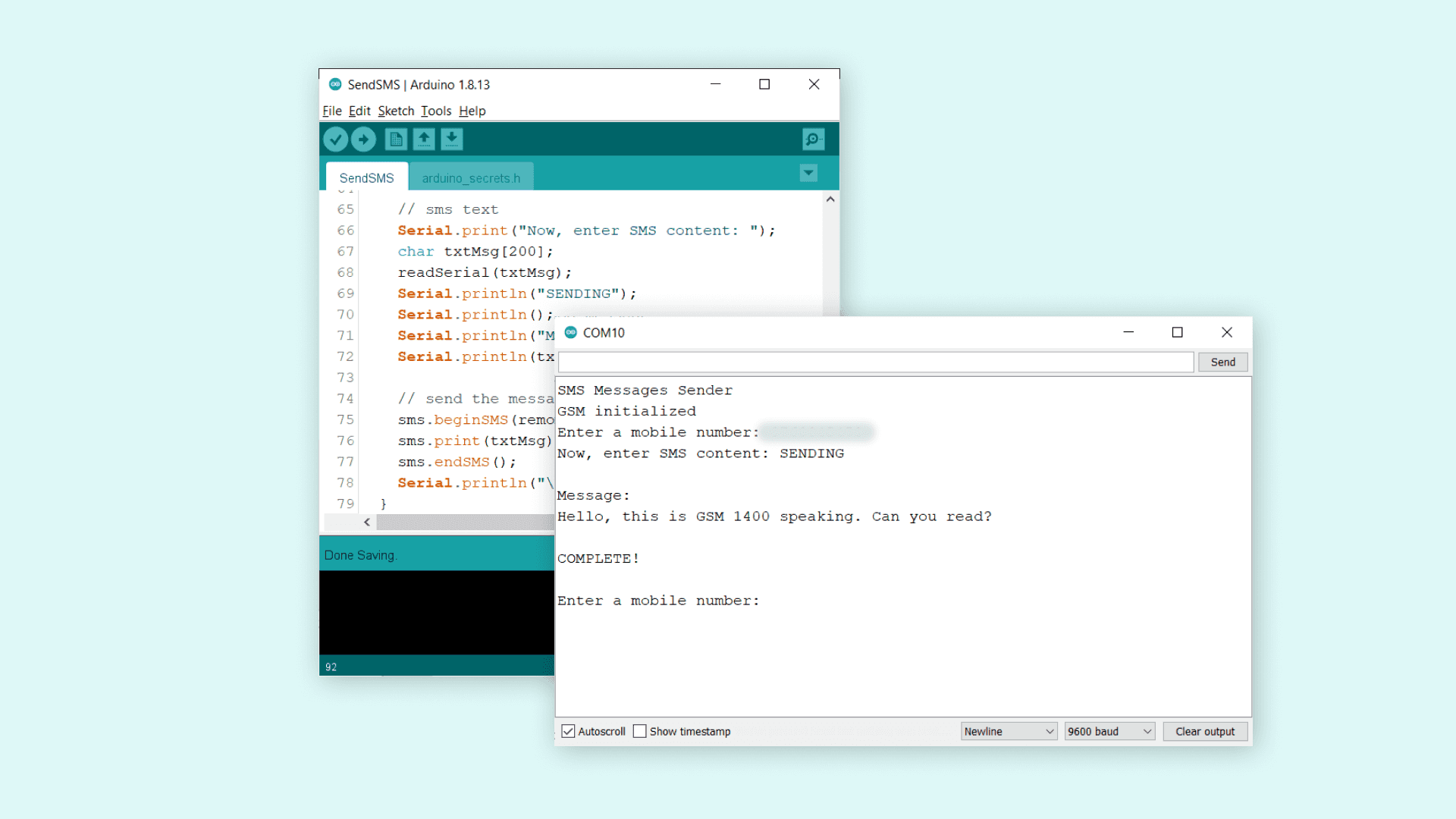 40 Serial.print("Enter a mobile number: ");41 char remoteNum[20]; // telephone number to send sms42 readSerial(remoteNum);43 Serial.println(remoteNum);44