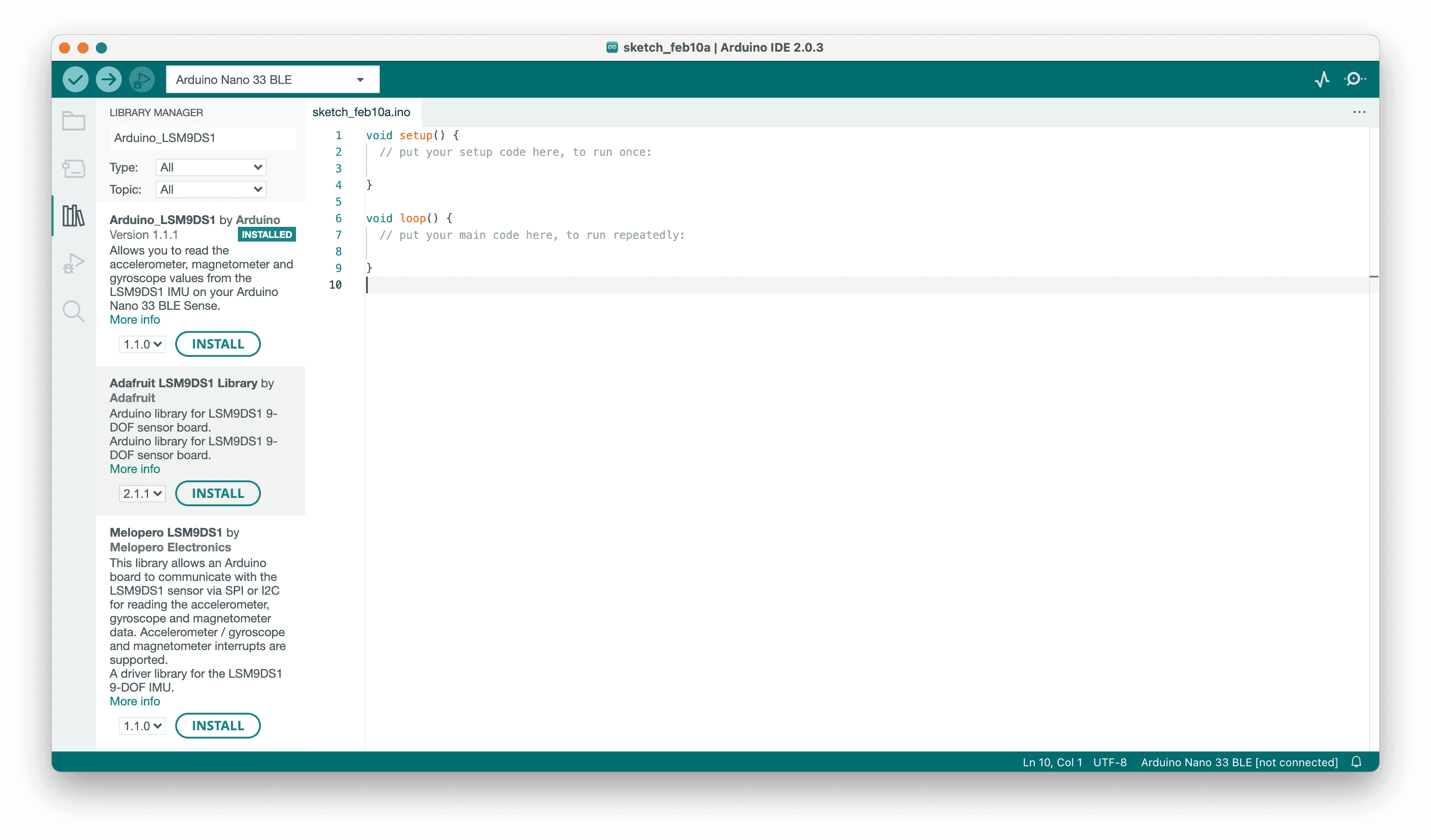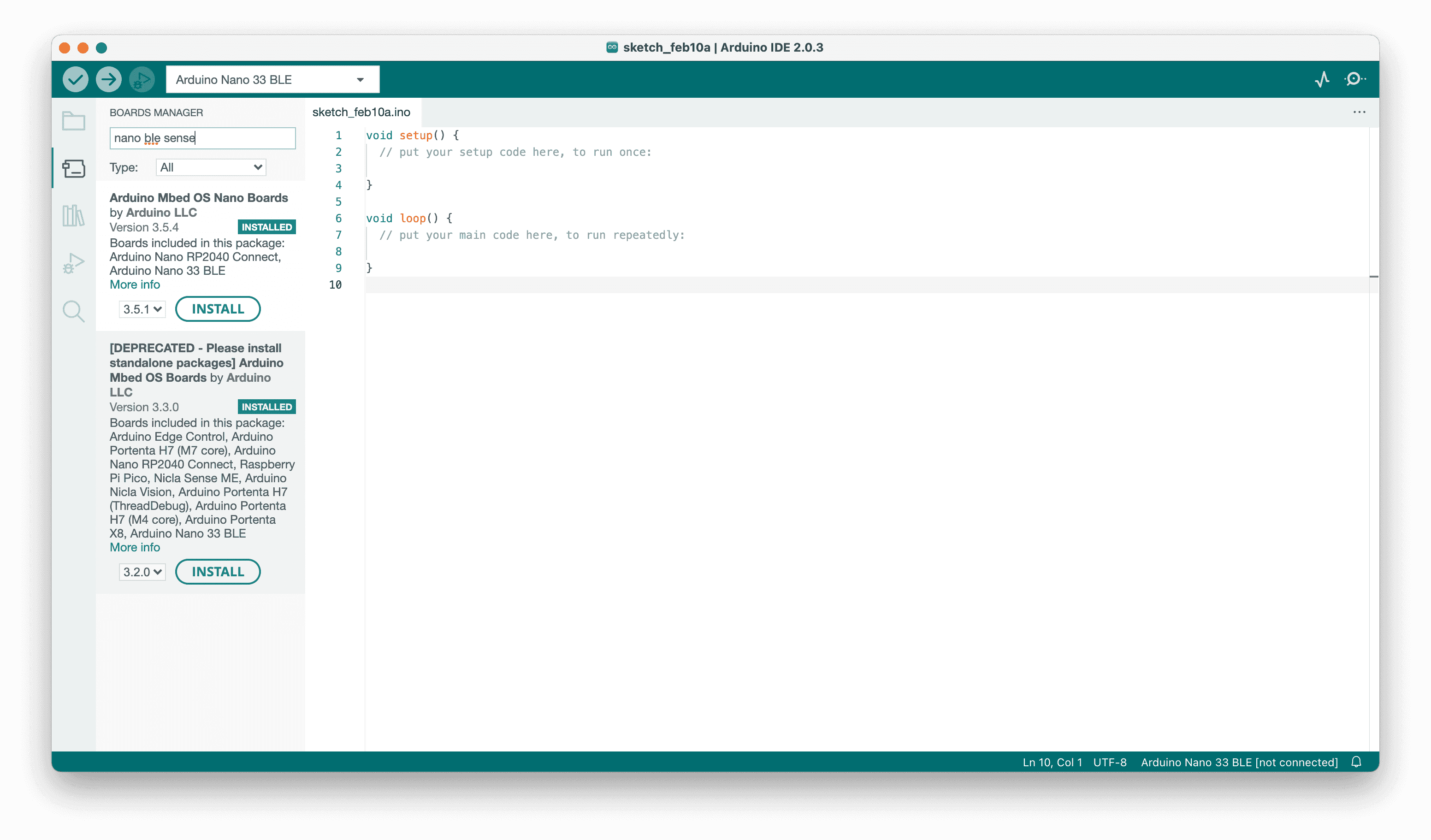 1. First, let's make sure we have the drivers for the Nano 33 BLE boards installed. Select the board manager in the left panel, and search for "Nano 33 BLE" and install the "Arduino Mbed OS Nano Boards".