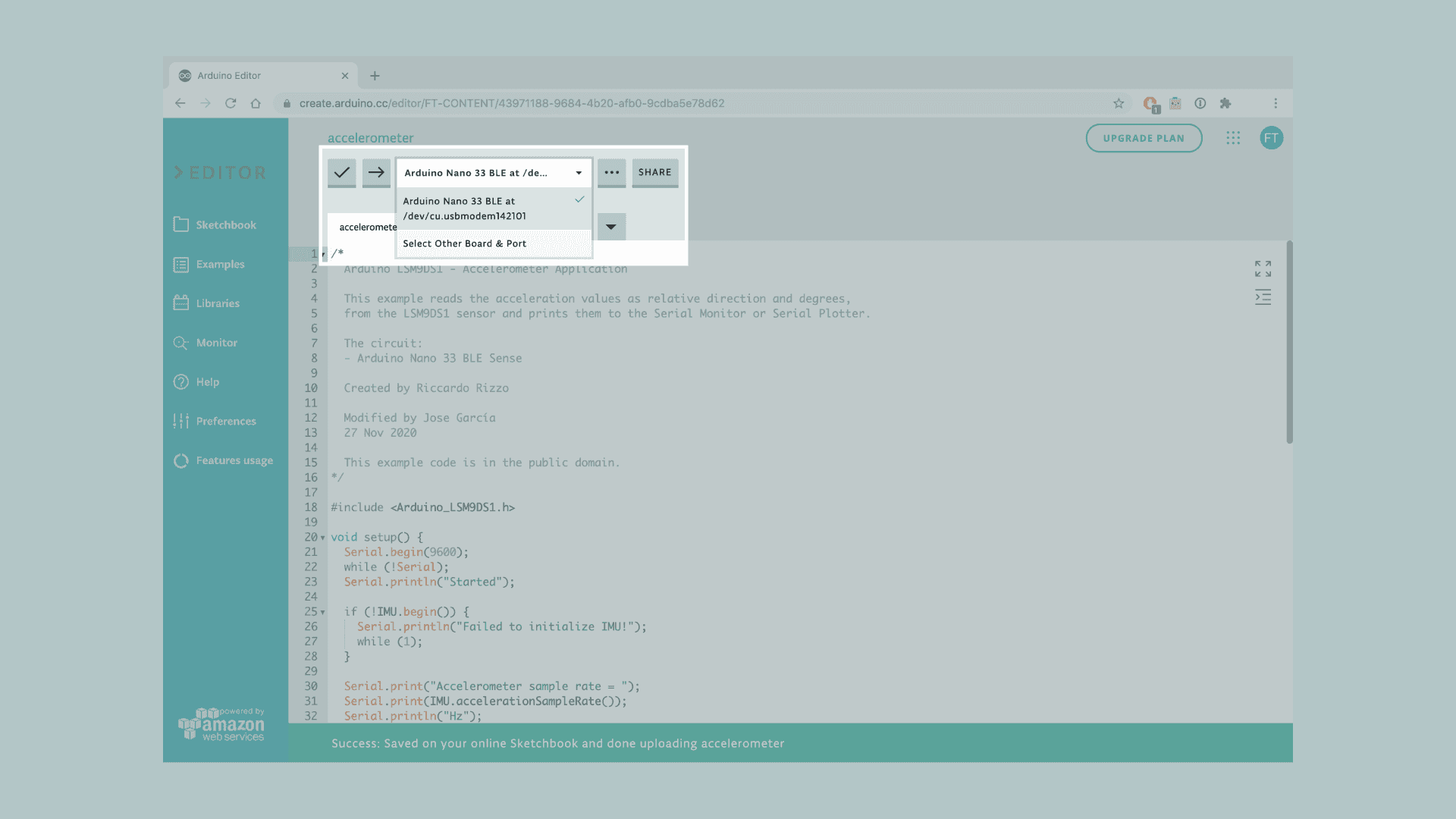 Let's start by opening the Arduino Web Editor, click on the Libraries tab and search for the LSM9DS1 library. Then in > Examples, open the SimpleAccelerometer sketch and once it opens, rename it as Accelerometer.