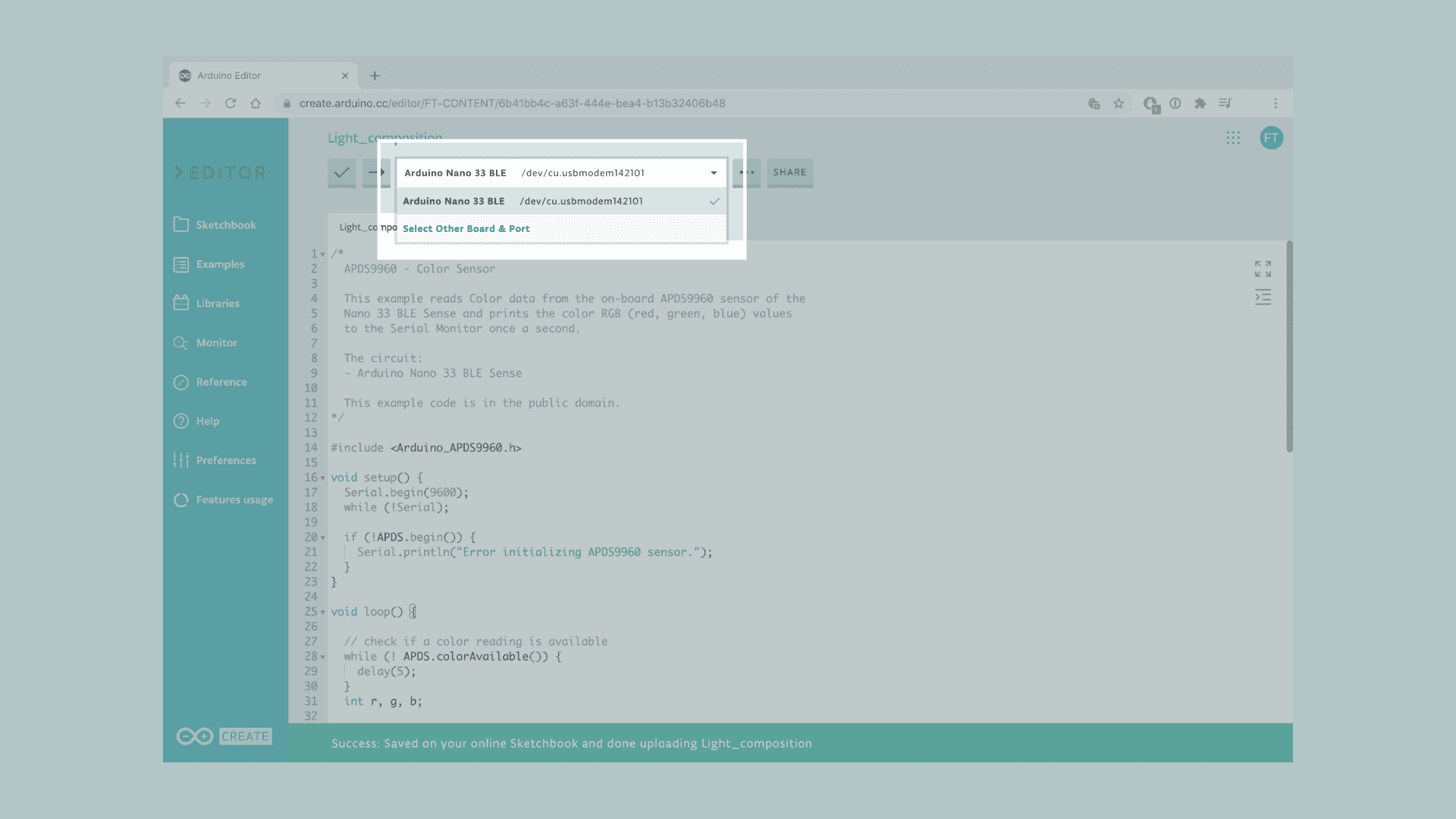 Let's start by opening the Arduino Web Editor, click on the Libraries tab, search for the APDS9960 library, then in Examples, open the ColorSensor example. Once the sketch is open, rename it as Light_composition.