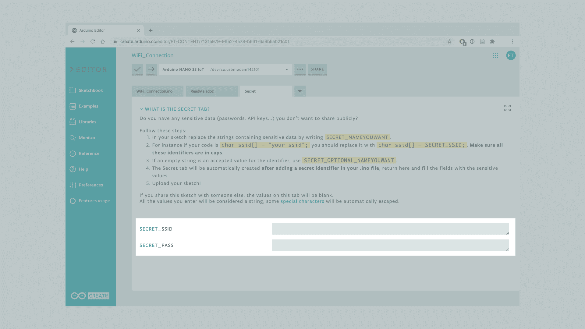 1//please enter your sensitive data in the Secret tab2char ssid[] = SECRET_SSID; // your network SSID (name)3char pass[] = SECRET_PASS; // your network password (use for WPA, or use as key for WEP)