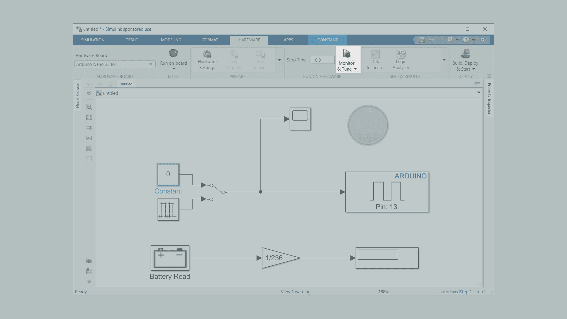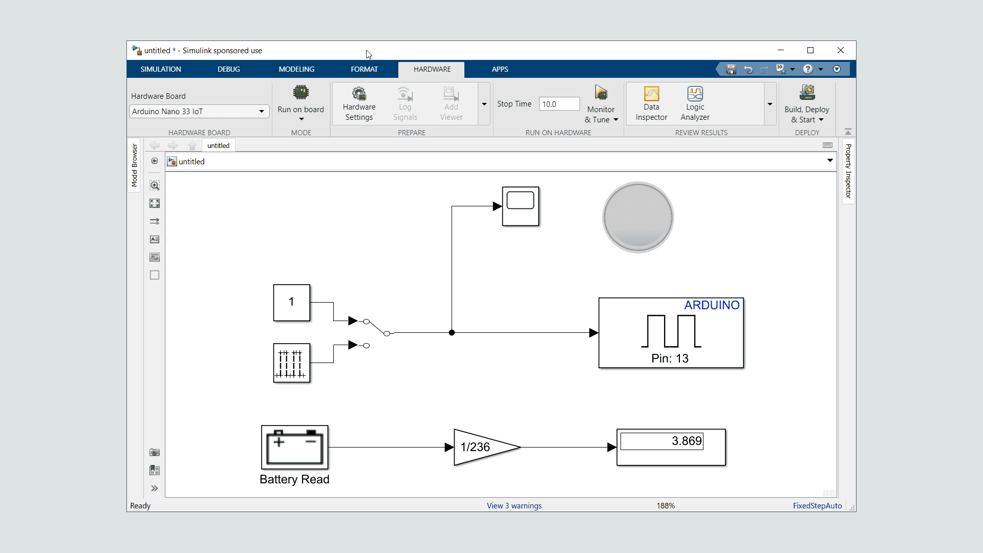 then click on OK.7. Go to the Hardware ribbon. Make sure that the Mode is set to Run on board and that the Stop Time is set to 10. Click on Monitor and Tune. You should see the value on the Display block correspond to the voltage of the battery.