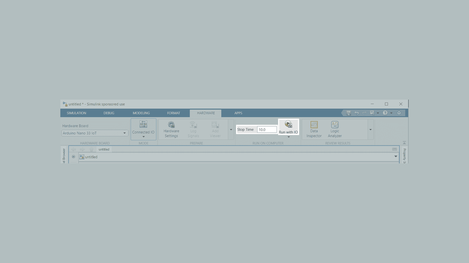 1. We will now configure Simulink to access the hardware IO directly. This will allow you to directly control the LED on the Nano 33 IoT, from the model running in your computer.