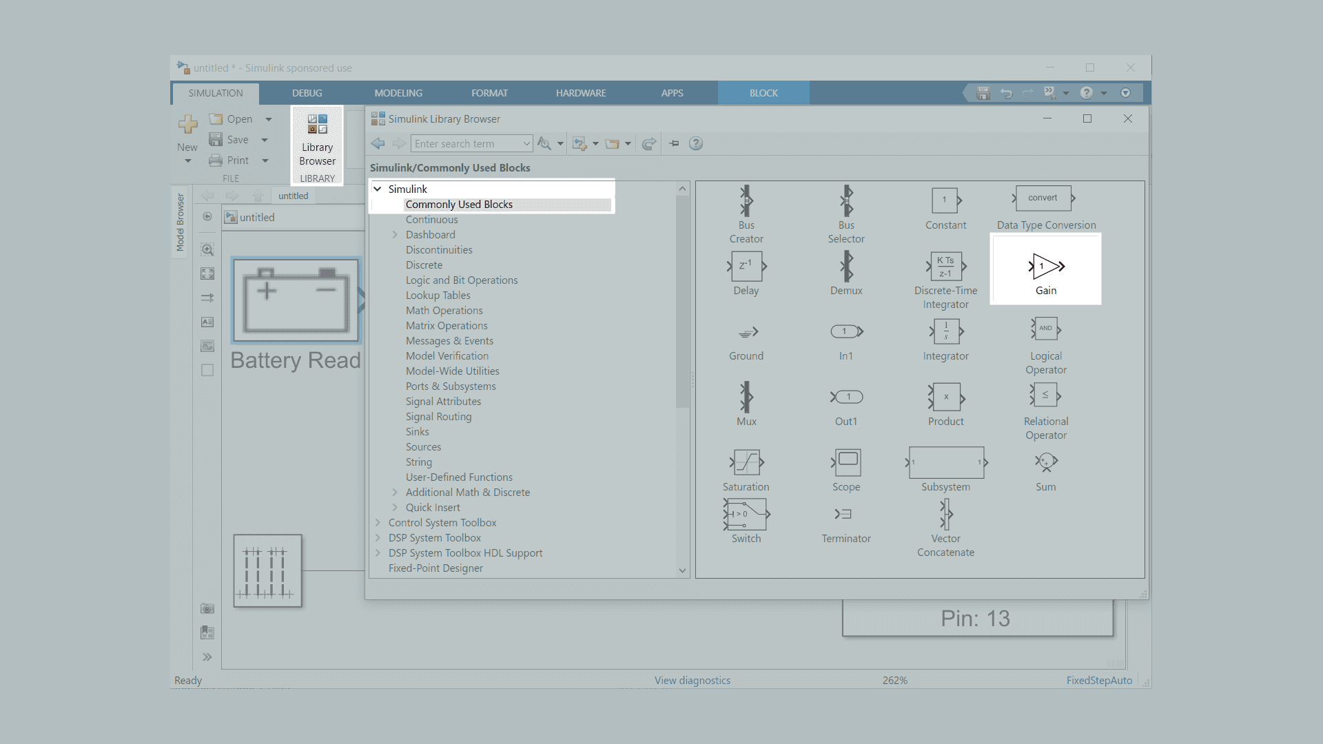 3. The Battery Read block gives the voltage as an integer between 0 to 4095. To convert this raw value into voltage, we will need to multiple it by 12/4095. To do so we can get the help of a Gain block. Go up to the Simulink section and under Commonly Used Blocks add the Gain block to your model.