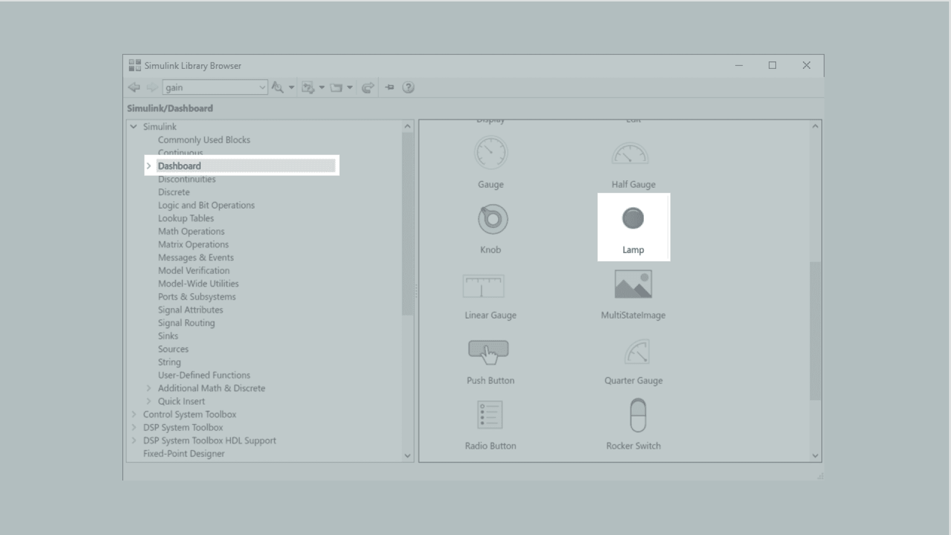13. Simulink also has the option to use Dashboard blocks to visualize the state of the LED. You can find these blocks in the Library Browser, under Simulink->Dashboard. For the purposes of this tutorial, click and drag the Lamp block to the canvas.