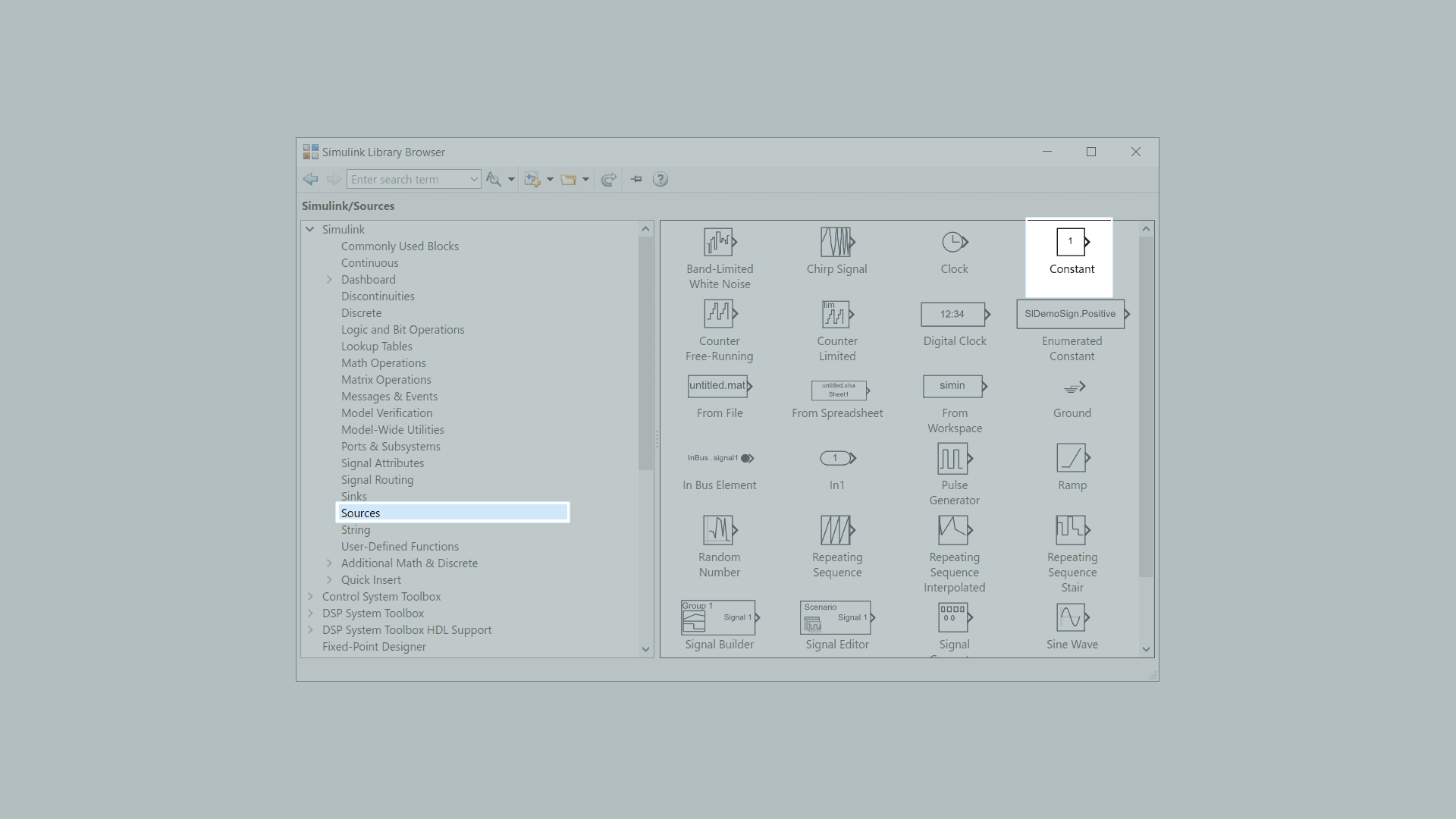 5. Go back to the Simulink Library Browser and under Simulink click on Sources. A list of different components that can act as sources, appear. Add the Pulse Generator block to you model. This block will help us generate the signal to turn the LED on and off.
