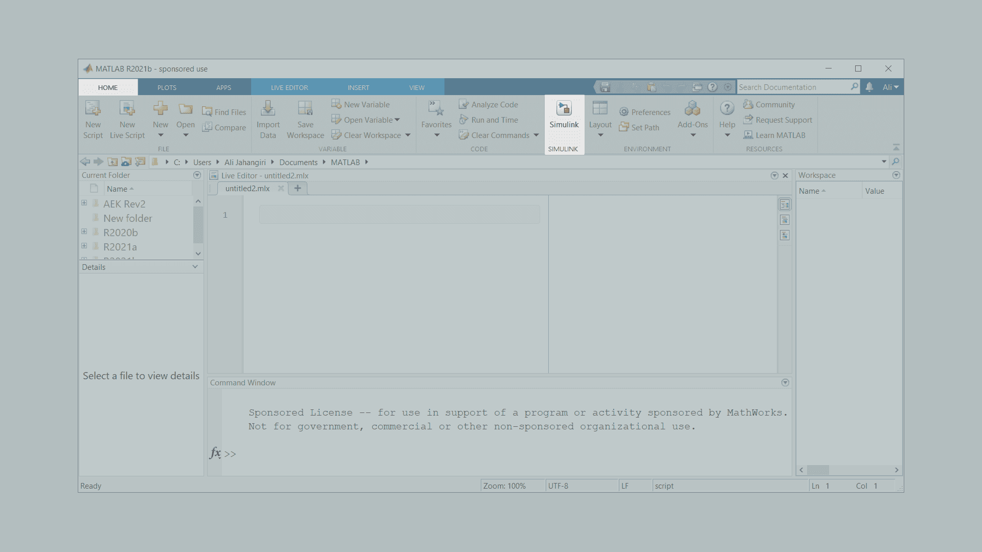 1. Open MATLAB. Under the Home ribbon, click on the Simulink button to open it.