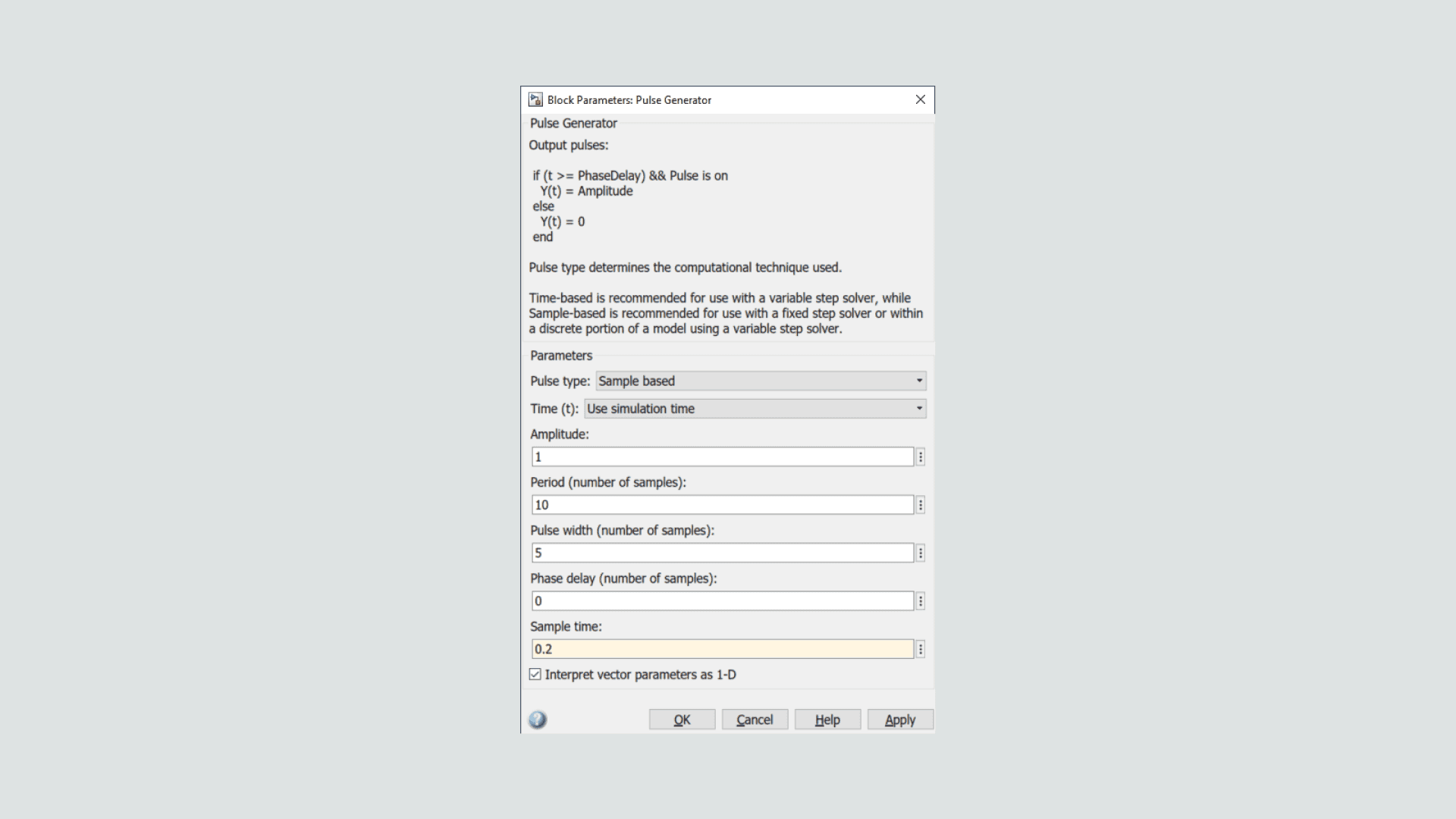 10. Now let us configure the Pulse Generator block. Double click on the Pulse Generator block to open up its Block Parameters. First, we will configure the Pulse type to be Sample based, since we are going to have a fixed time step. Set the Sample Time to be 0.2. This means that our model will operate in increments of one fifth of a second. An Amplitude of 1 is equivalent to a HIGH digital value for our model. Since we will define each Period to have 10 samples, then considering the Sample Time of 0.2 seconds, the duration of each period will be 2 seconds. The Pulse Width is defined as 5 samples. This will generate a periodic waveform, that turns on and off every one second.
