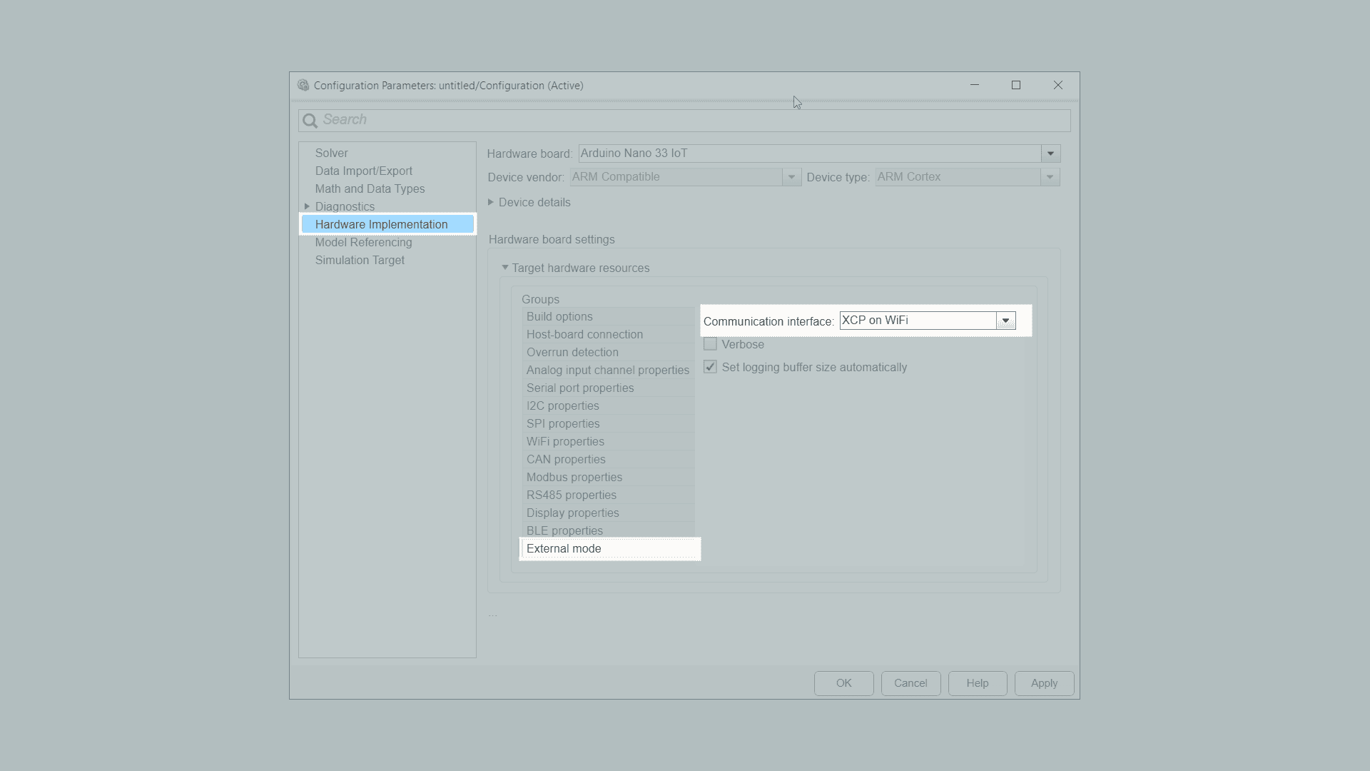1. Open up the Hardware Settings from the Hardware Ribbon. In the Hardware Implementation tab, under the Target hardware resources click on External mode then choose