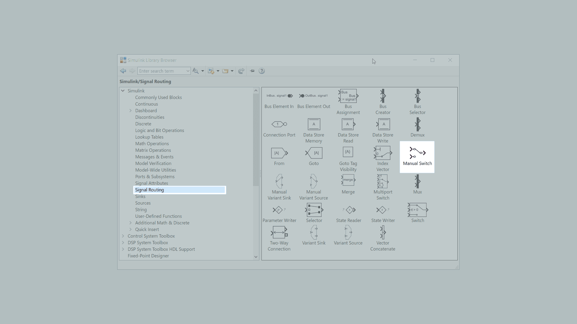 3. Let us try and add a switch so that we can control the LED wirelessly via Simulink. From the Simulink Library Browser, under Simulink->Signal Routing->Sources add the Manual Switch to the model. Also add the Constant block from the Sources group.