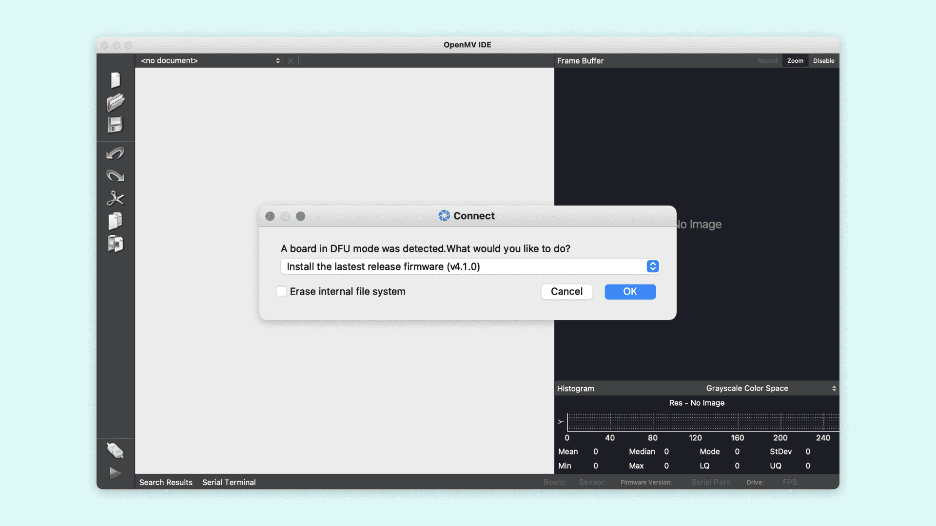 A pop-up will ask you how you would like to proceed "A board in DFU mode was detected. What would you like to do?". Select "Install the latest release firmware". This will install the latest OpenMV firmware. If it asks you whether it should erase the internal file system you can click "No".
